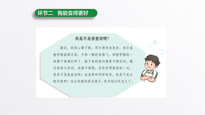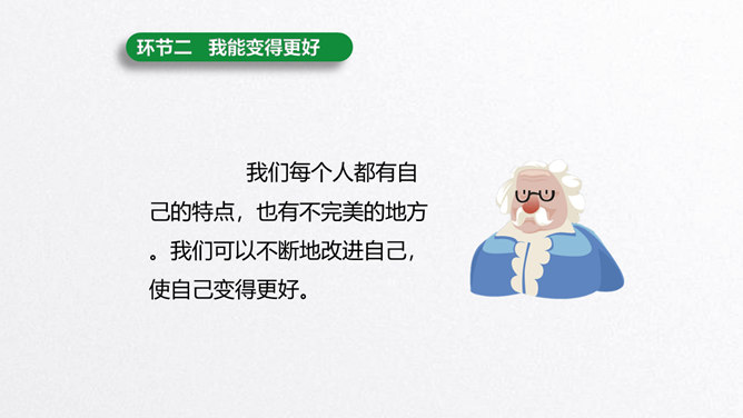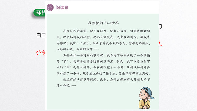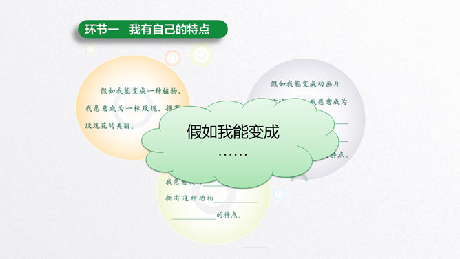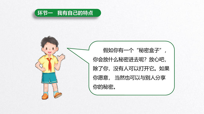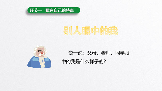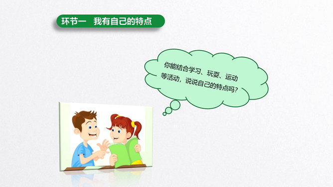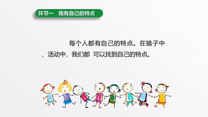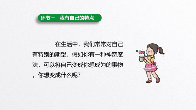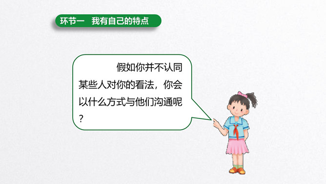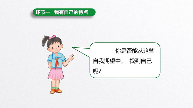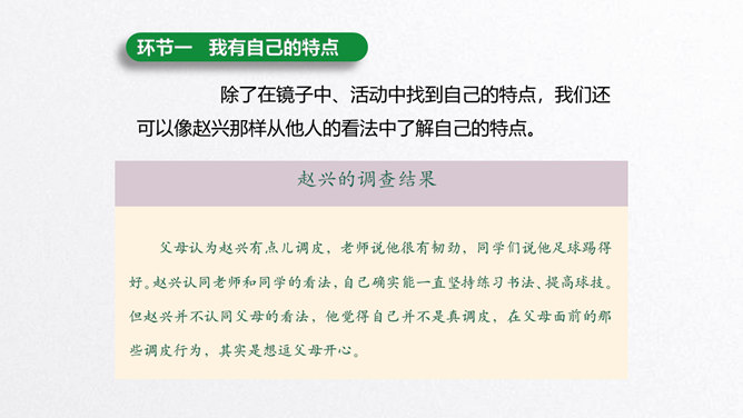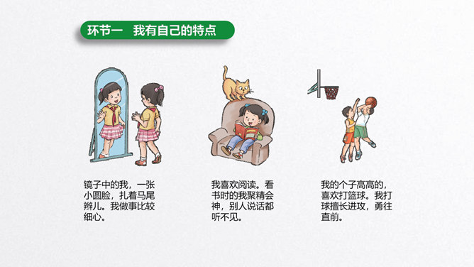 每个人都有自己的特点。在镜子中、活动中,我们都可以找到自己的特点。镜子中的我,一张小圆脸,扎着马尾辫儿。我做事比较细心。我喜欢阅读。看书时的我聚精会神,别人说话都听不见。我的个子高高的,喜欢打篮球。我打球擅长进攻,勇往直前。你能结合学习、玩耍、运动等活动,说说自己的特点吗?除了在镜子中、活动中找到自己的特点,我们还可以像赵兴那样从他人的看法中了解自己的特点。说一说:父母、老师、同学眼中的我是什么样子的?假如你并不认同某些人对你的看法,你会以什么方式与他们沟通呢?所属专题:我是独特的ppt。