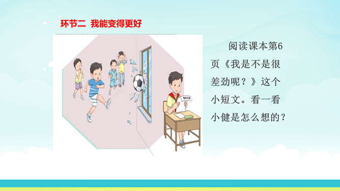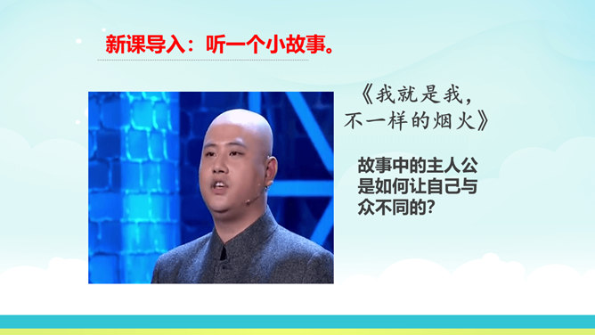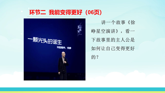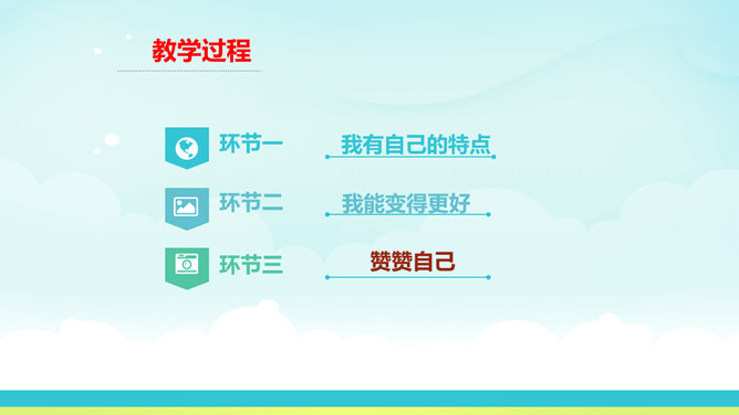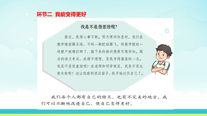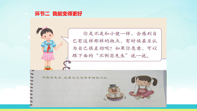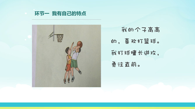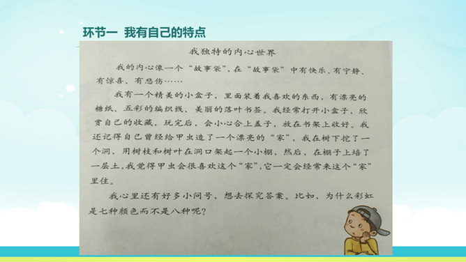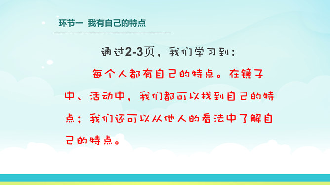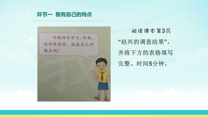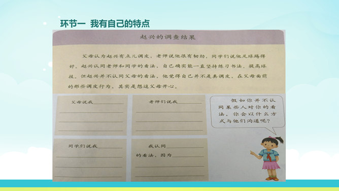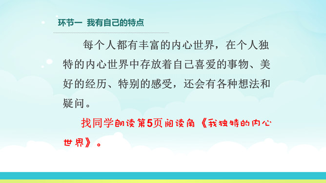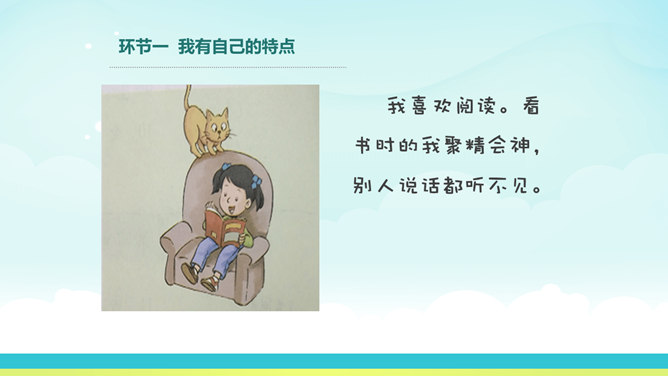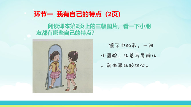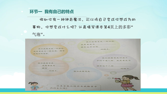 阅读课本第2页上的三幅图片,看一下小朋友都有哪些自己的特点?镜子中的我,一张小圆脸,扎着马尾辫儿。我做事比较细心。我喜欢阅读。看书时的我聚精会神,别人说话都听不见。我的个子高高的,喜欢打篮球。我打球擅长进攻,勇往直前。每个人都有自己的特点。在镜子中、活动中,我们都可以找到自己的特点;我们还可以从他人的看法中了解自己的特点。假如你有一种神奇魔法,可以将自己变成你想成为的事物,你想变成什么呢?认真填写课本第4页上的多彩“气泡”。所属专题:我是独特的ppt。