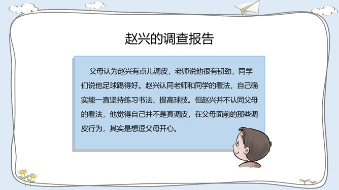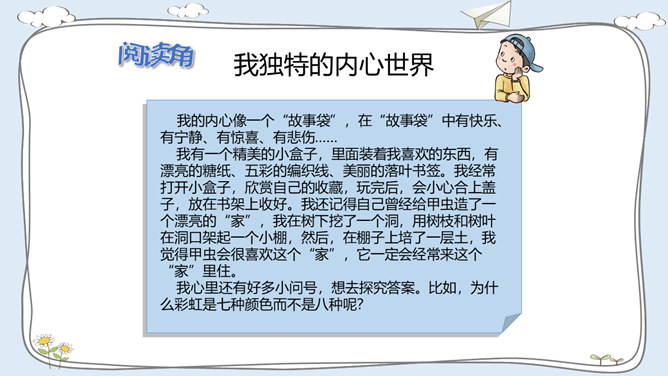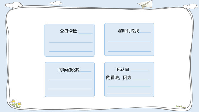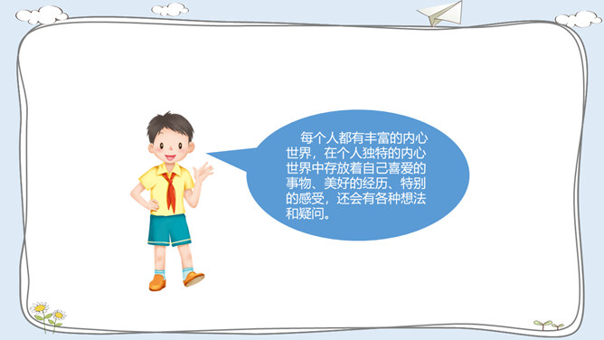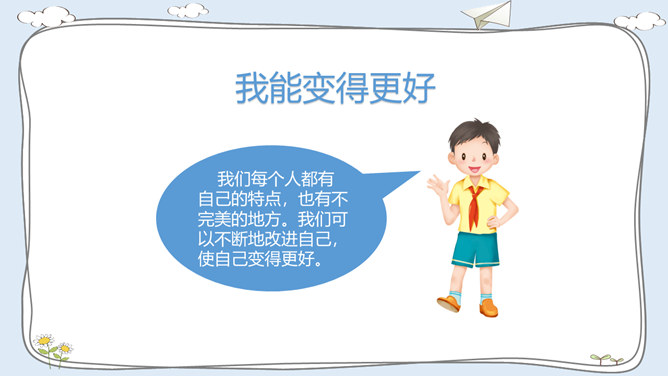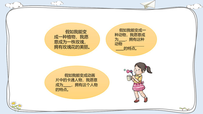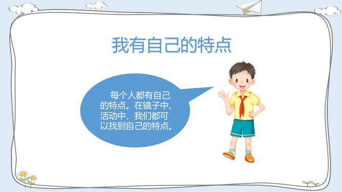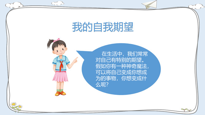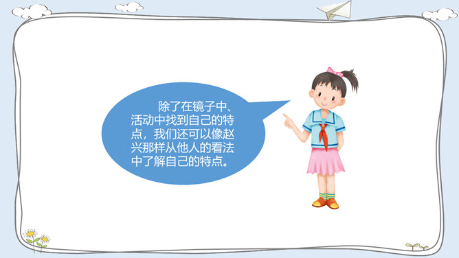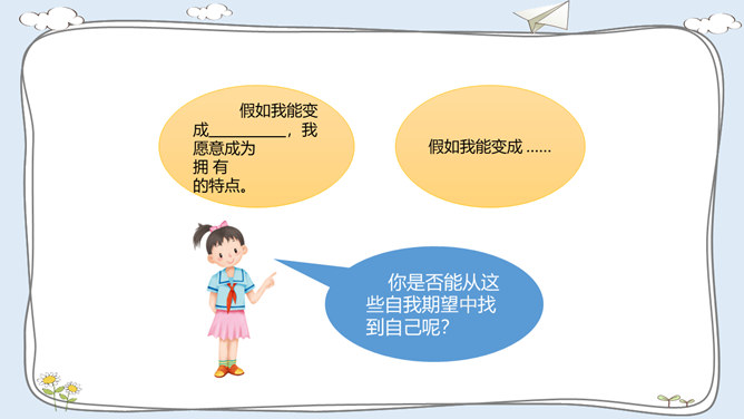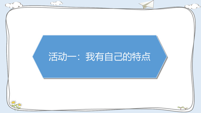 活动一:我有自己的特点。每个人都有自己的特点。在镜子中、活动中,我们都可以找到自己的特点。除了在镜子中、活动中找到自己的特点,我们还可以像赵兴那样从他人的看法中了解自己的特点。假如你并不认同某些人对你的看法,你会以什么样的方式与他们沟通呢?活动二:我的自我期望。在生活中,我们常常对自己有特别的期望。假如你有一种神奇魔法,可以将自己变成你想成为的事物,你想变成什么呢?假如我能变成一种植物,我愿意成为一株玫瑰,拥有玫瑰花的美丽。所属专题:我是独特的ppt。