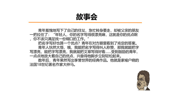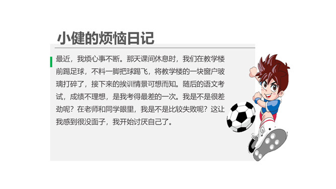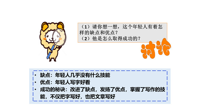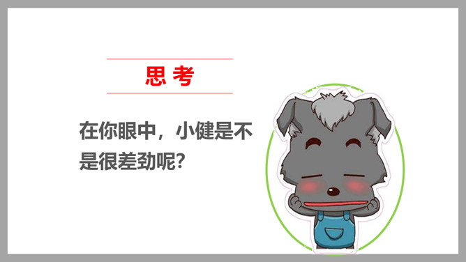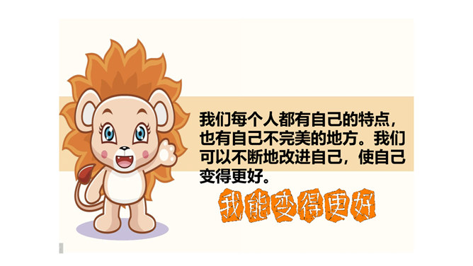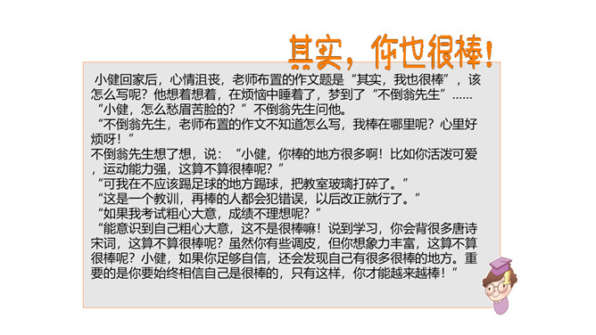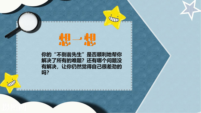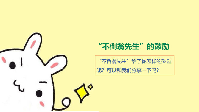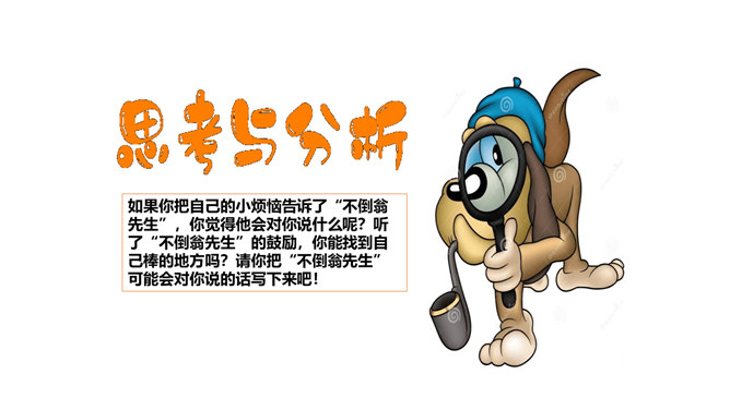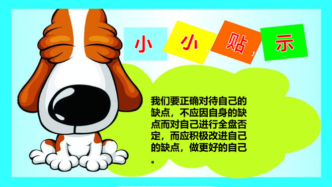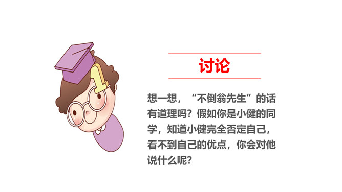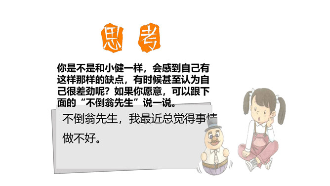 我们每个人都有自己的特点,也有自己不完美的地方。我们可以不断地改进自己,使自己变得更好。想一想,“不倒翁先生”的话有道理吗?假如你是小健的同学,知道小健完全否定自己,看不到自己的优点,你会对他说什么呢?我们要正确对待自己的缺点,不应因自身的缺点而对自己进行全盘否定,而应积极改进自己的缺点,做更好的自己。你是不是和小健一样,会感到自己有这样那样的缺点,有时候甚至认为自己很差劲呢?如果你愿意,可以跟下面的“不倒翁先生”说一说。所属专题:我是独特的ppt。