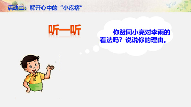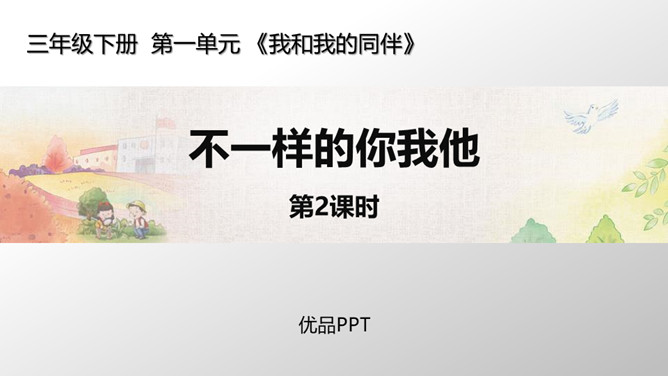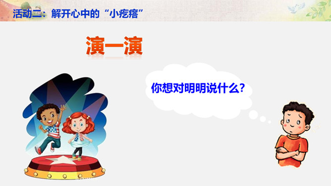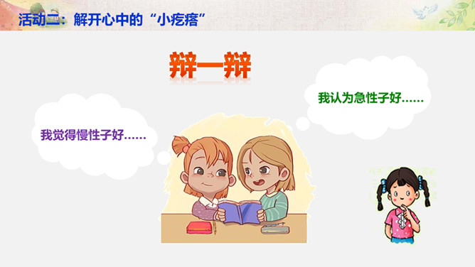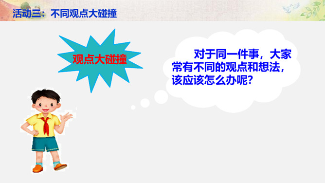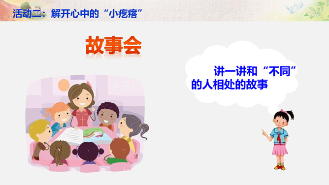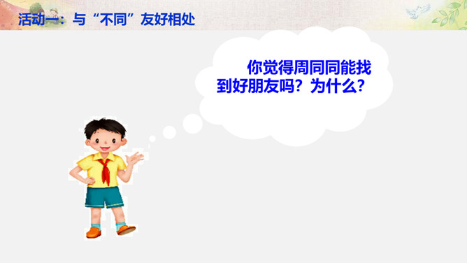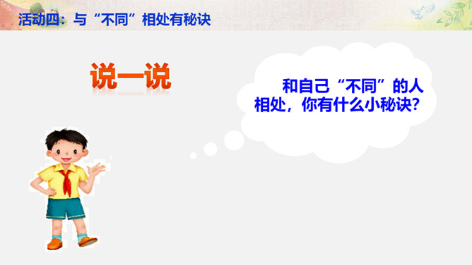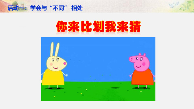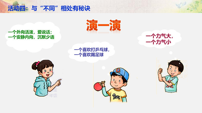 活动一:学会与“不同” 相处。你来比划我来猜。你觉得周同同能找到好朋友吗?为什么?活动二:解开心中的“小疙瘩”。讲一讲和“不同”的人相处的故事。你想对明明说什么?我觉得慢性子好……我认为急性子好……辩一辩。你赞同小亮对李雨的看法吗?说说你的理由。活动三:不同观点大碰撞。对于同一件事,大家常有不同的观点和想法,该应该怎么办呢?活动四:与“不同”相处有秘诀。个外向活泼,爱说话;一个安静内向,沉默少语。一个喜欢打乒乓球,一个喜欢踢足球。一个力气大,一个力气小。所属专题:不一样的你我他ppt。