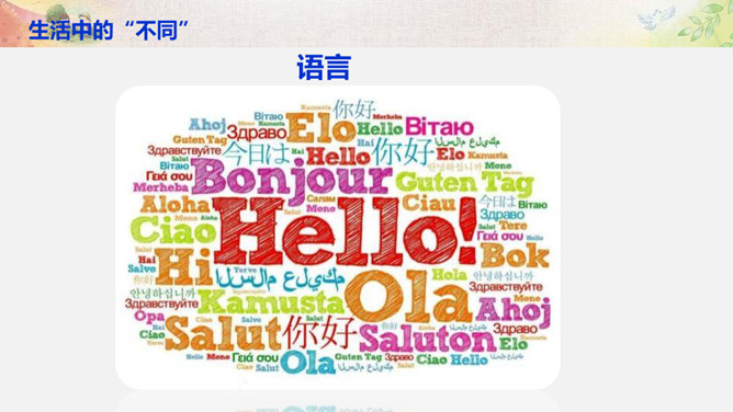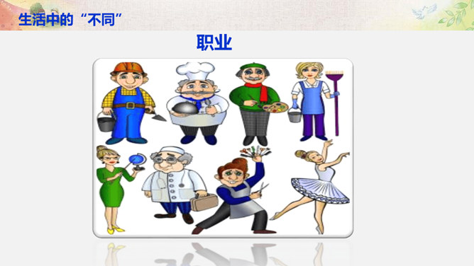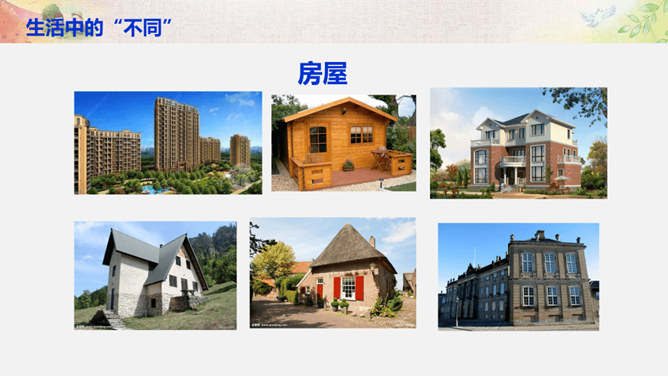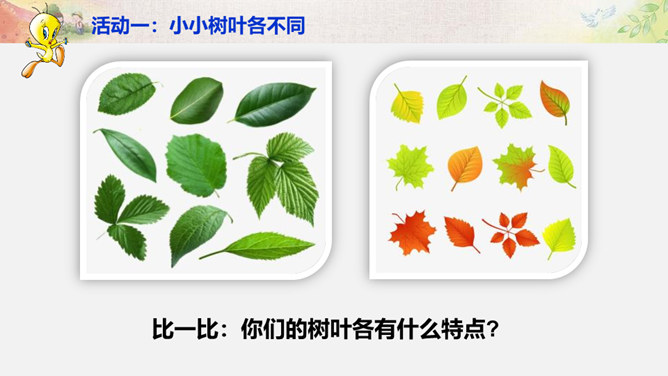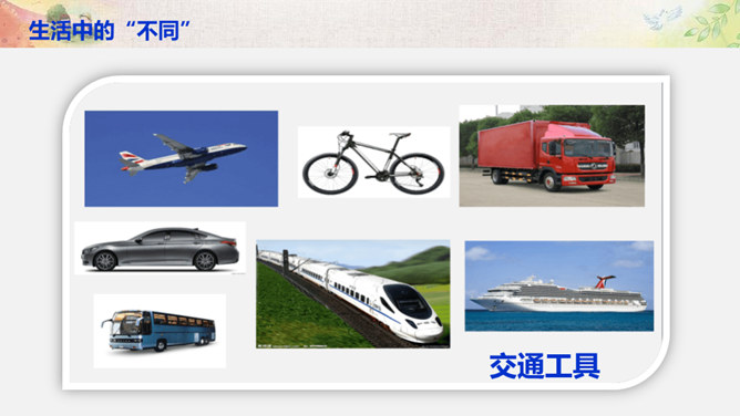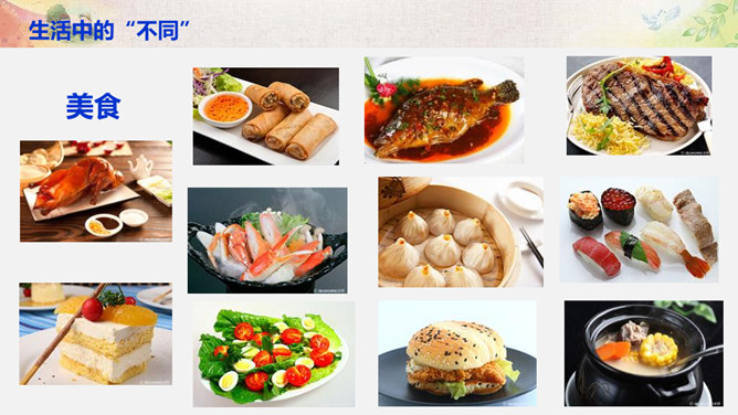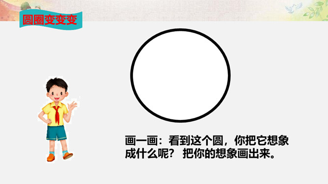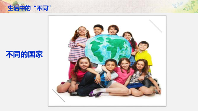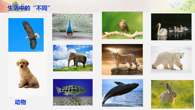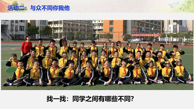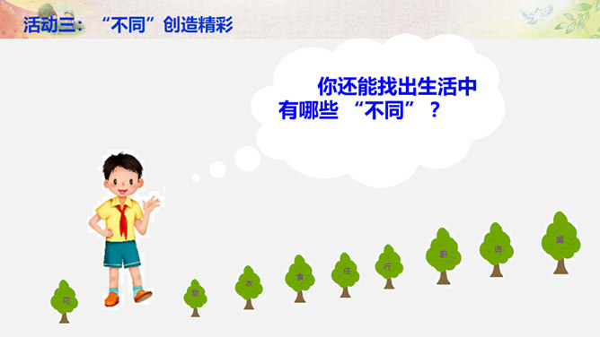 比一比:你们的树叶各有什么特点?找一找:同学之间有哪些不同?画一画:看到这个圆,你把它想象成什么呢? 把你的想象画出来。你还能找出生活中有哪些 “不同” ?你还能找出生活中有哪些 “不同” ?你还能找出哪些由于“不同”,给生活带来精彩的例子呢?你愿意根据自己的特点、发挥自己的特长,为班级,为校园,为社会创造出更多的“精彩”吗?把你的愿望写下来。所属专题:不一样的你我他ppt。