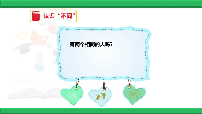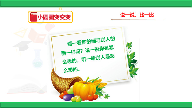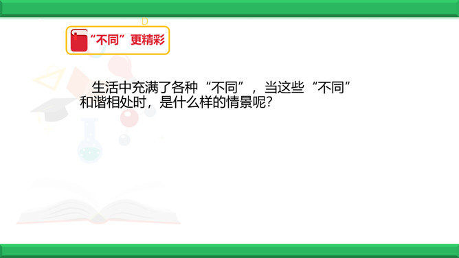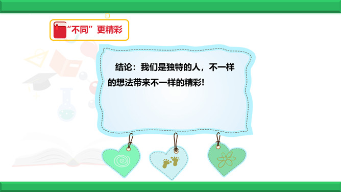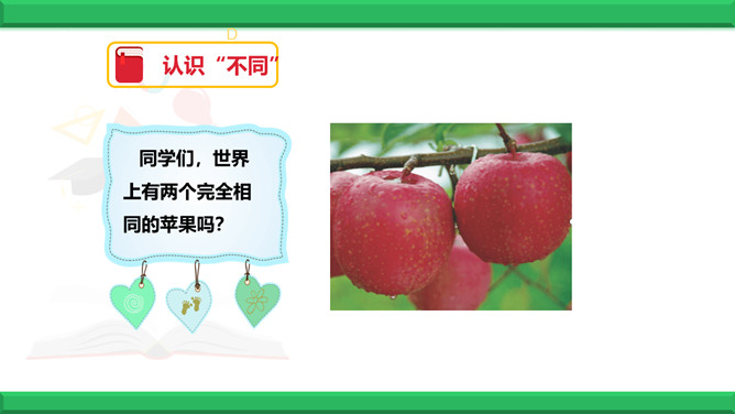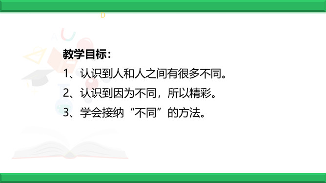教学目标:1、认识到人和人之间有很多不同。2、认识到因为不同,所以精彩。3、学会接纳“不同”的方法。同学们,世界上有两个完全相同的苹果吗?有两个相同的人吗?同学们有很多相同点,可在长相、性格、爱好、特长等又有很多不同。下面有一幅画,这幅画中的圆圈可能是什么呢?发挥你的想象力,把画儿画完。看一看你的画与别人的画一样吗?说一说你是怎么想的,听一听别人是怎么想的。结论:我们是独特的人,不一样的想法带来不一样的精彩!生活中充满了各种“不同”,当这些“不同”和谐相处时,是什么样的情景呢?所属专题:不一样的你我他ppt。