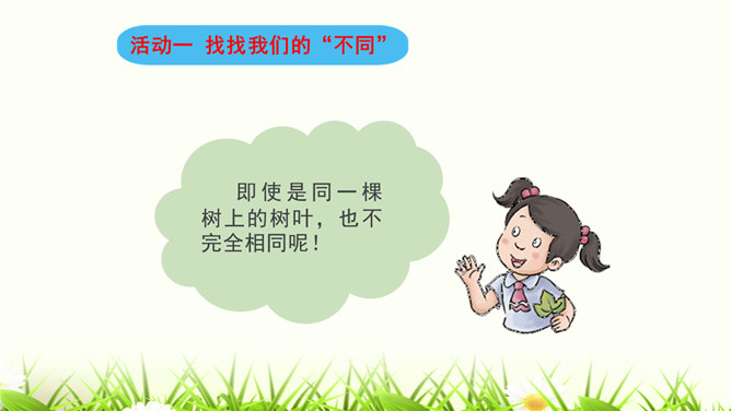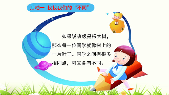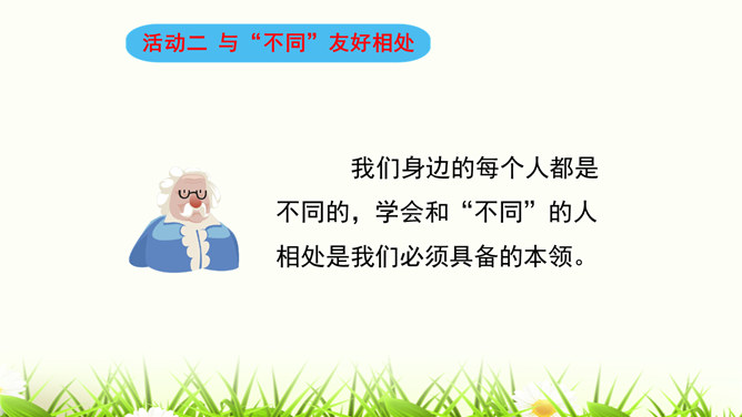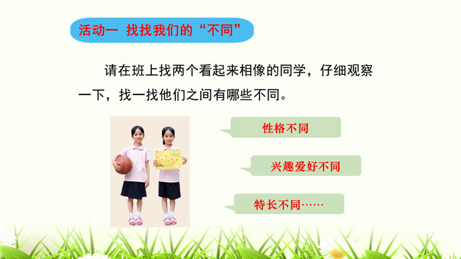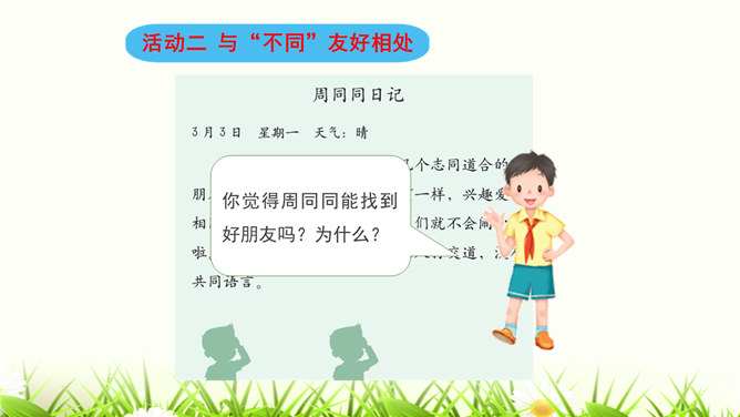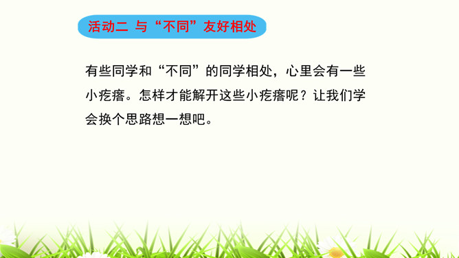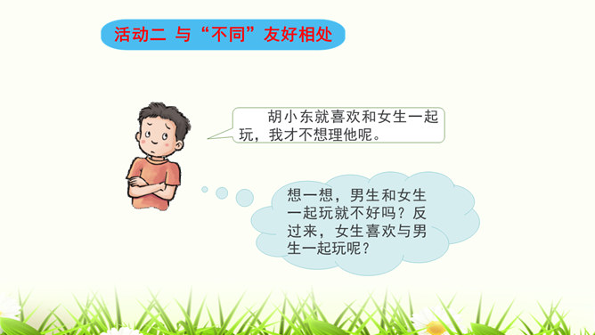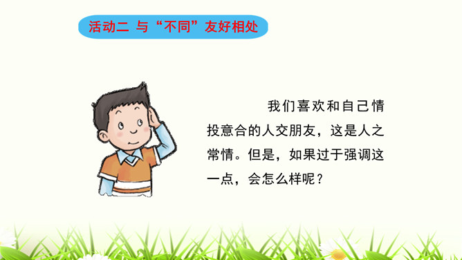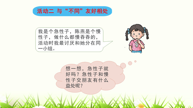 我们喜欢和自己情投意合的人交朋友,这是人之常情。但是,如果过于强调这一点,会怎么样呢?你觉得周同同能找到好朋友吗?为什么?我们身边的每个人都是不同的,学会和“不同”的人相处是我们必须具备的本领。有些同学和“不同”的同学相处,心里会有一些小疙瘩。怎样才能解开这些小疙瘩呢?让我们学会换个思路想一想吧。胡小东就喜欢和女生一起玩,我才不想理他呢。想一想,男生和女生一起玩就不好吗?反过来,女生喜欢与男生一起玩呢?想一想,急性子就好吗?急性子和慢性子交朋友有什么益处呢?所属专题:不一样的你我他ppt。