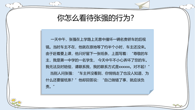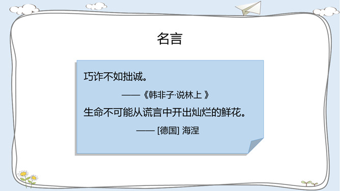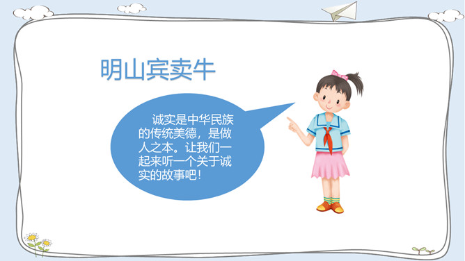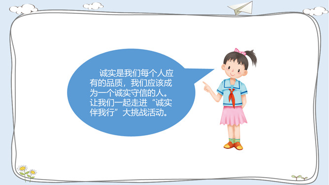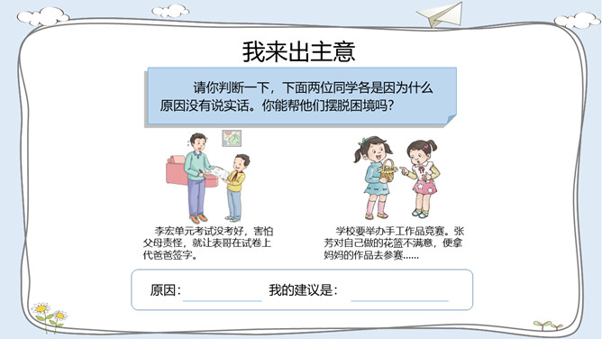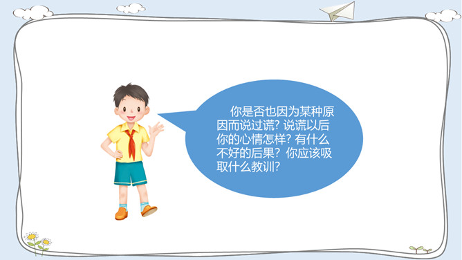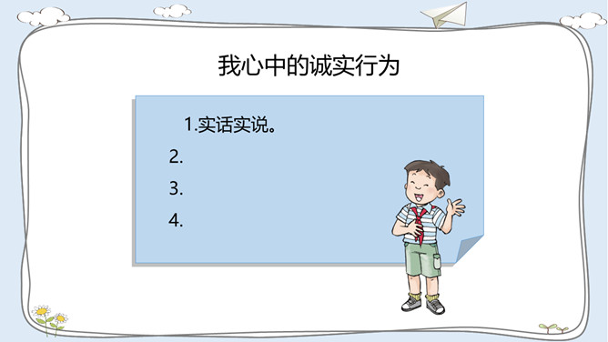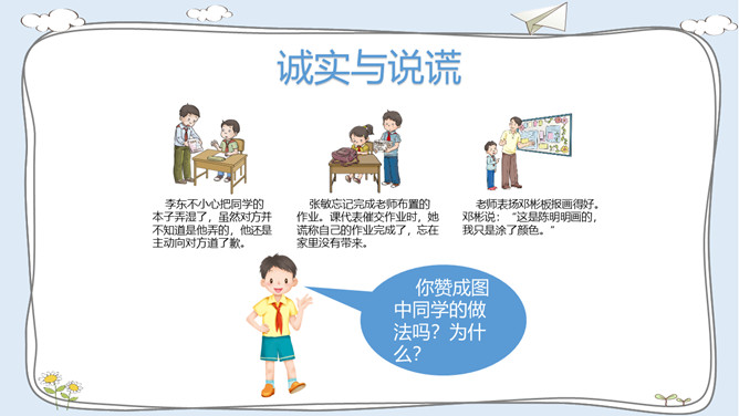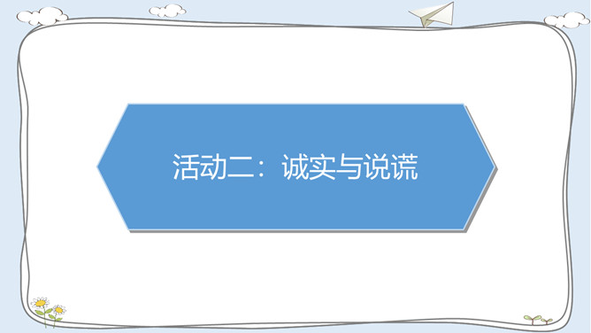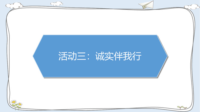 活动一:走进故事屋。诚实是中华民族的传统美德,是做人之本。让我们一起来听一个关于诚实的故事吧!活动二:诚实与说谎。李东不小心把同学的本子弄湿了,虽然对方并不知道是他弄的,他还是主动向对方道了歉。张敏忘记完成老师布置的作业。课代表催交作业时,她谎称自己的作业完成了,忘在家里没有带来。老师表扬邓彬板报画得好。邓彬说:“这是陈明明画的,我只是涂了颜色。”你赞成图中同学的做法吗?为什么?你是否也因为某种原因而说过谎? 说谎以后你的心情怎样? 有什么不好的后果?你应该吸取什么教训?所属专题:我很诚实ppt。