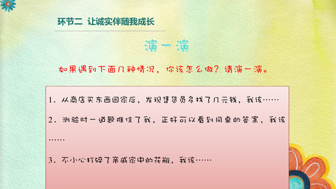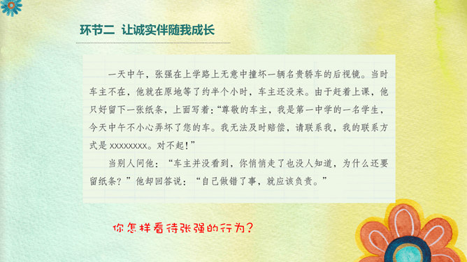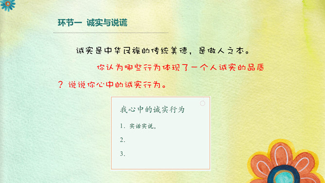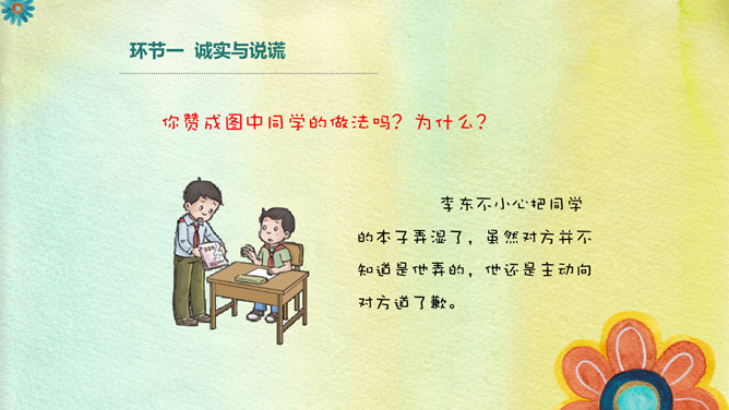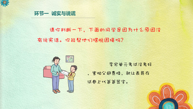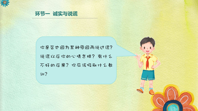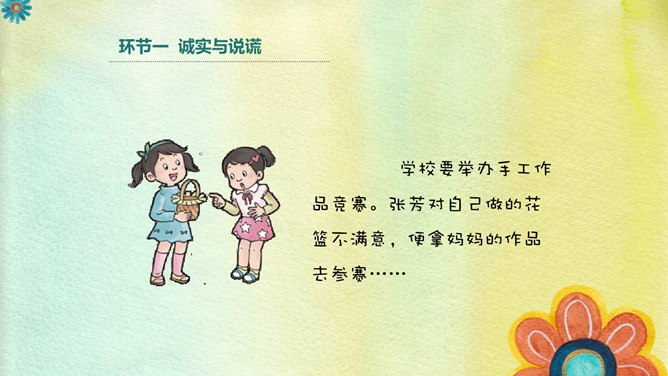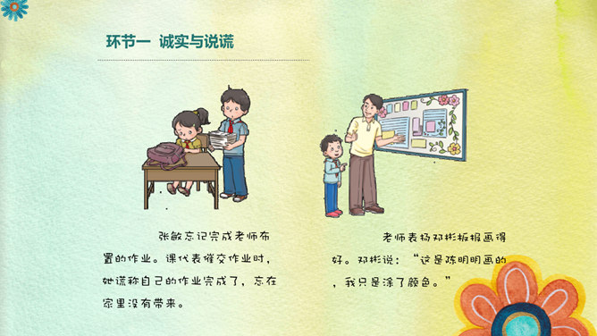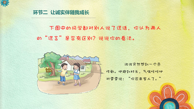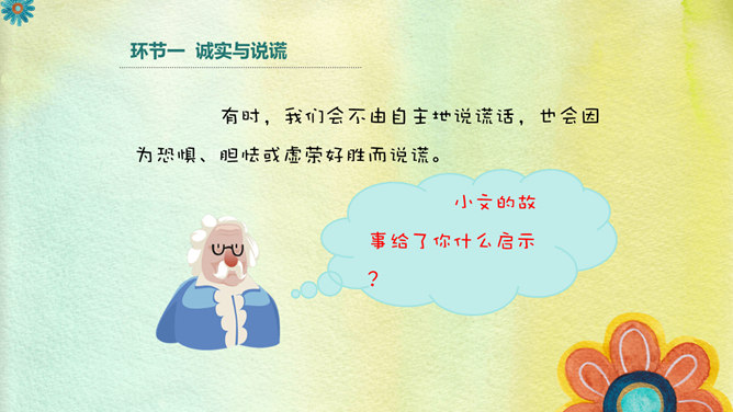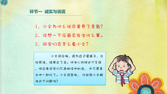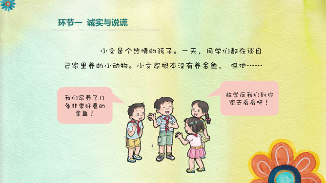 小文是个热情的孩子。一天,同学们都在谈自己家里养的小动物。小文家根本没有养金鱼, 但他…… 我们家养了几条非常好看的金鱼!放学后我们到你家去看看吧!1.小文为什么说家里养了金鱼? 2.设想一下后面会发生什么事。3.同学们会怎么看小文? 小文很后悔,因为自己爱面子,没说实话,结果出了丑。他决心改掉这个毛病,但后来同学们不再相信他的话, 也不愿意与他一起玩了。小文很苦恼, 你能帮小文解决这个问题吗? 有时,我们会不由自主地说谎话,也会因为恐惧、胆怯或虚荣好胜而说谎。所属专题:我很诚实ppt。