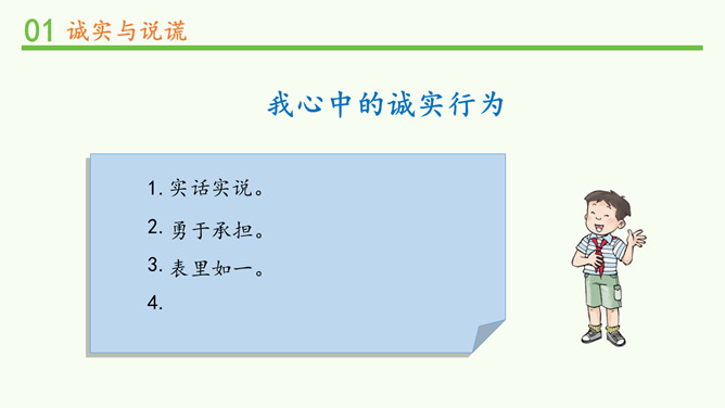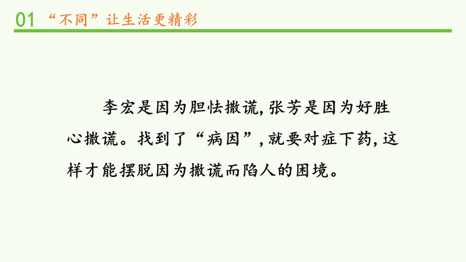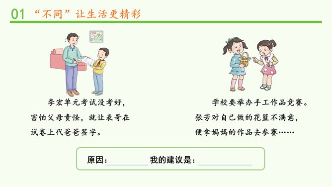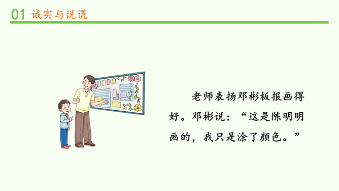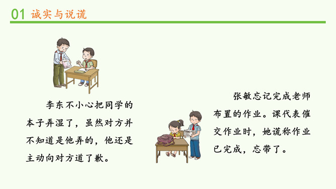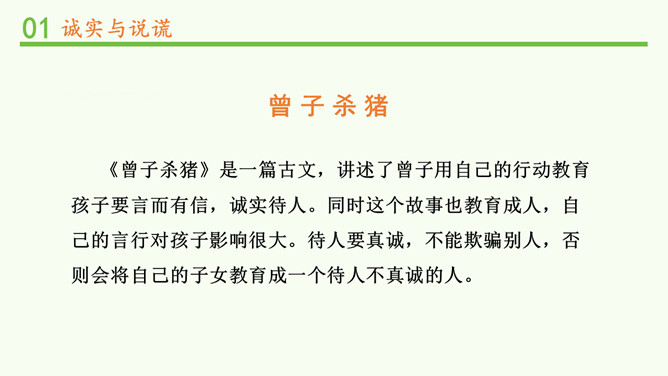 《曾子杀猪》是一篇古文,讲述了曾子用自己的行动教育孩子要言而有信,诚实待人。同时这个故事也教育成人,自己的言行对孩子影响很大。待人要真诚,不能欺骗别人,否则会将自己的子女教育成一个待人不真诚的人。不能为了个人的利益,对当事人隐瞒事情的真相。诚实是非常难能可贵的品质。李宏单元考试没考好,害怕父母责怪,就让表哥在试卷上代爸爸签字。学校要举办手工作品竞赛。张芳对自己做的花篮不满意,便拿妈妈的作品去参赛……李宏是因为胆怯撒谎,张芳是因为好胜心撒谎。所属专题:我很诚实ppt。