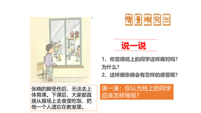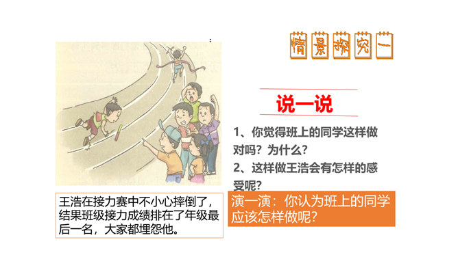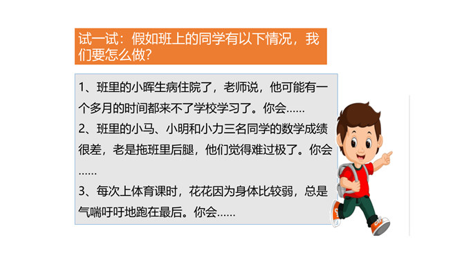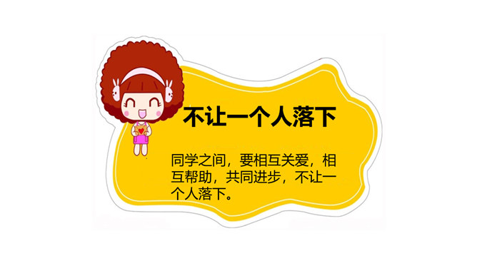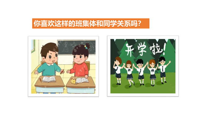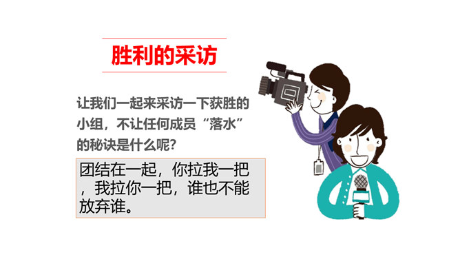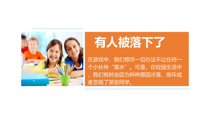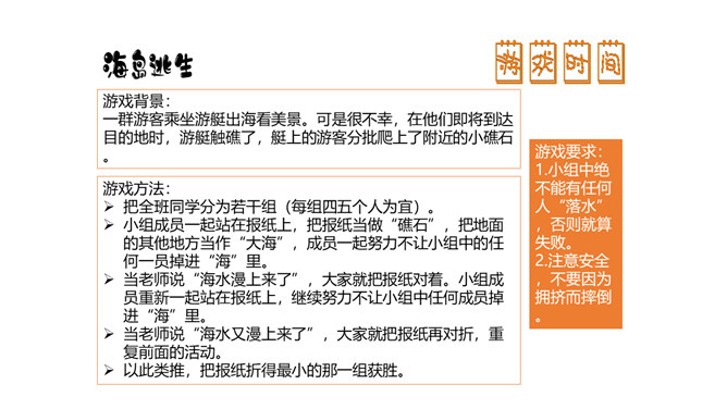 同学之间,要相互关爱,相互帮助,共同进步,不让一个人落下。游戏背景:一群游客乘坐游艇出海看美景。可是很不幸,在他们即将到达目的地时,游艇触礁了,艇上的游客分批爬上了附近的小礁石。游戏方法:把全班同学分为若干组(每组四五个人为宜)。小组成员一起站在报纸上,把报纸当做“礁石”,把地面的其他地方当作“大海”,成员一起努力不让小组中的任何一员掉进“海”里。当老师说“海水漫上来了”,大家就把报纸对着。小组成员重新一起站在报纸上,继续努力不让小组中任何成员掉进“海”里。当老师说“海水又漫上来了”,大家就把报纸再对折,重复前面的活动。以此类推,把报纸折得最小的那一组获胜。所属专题:同学相伴ppt。