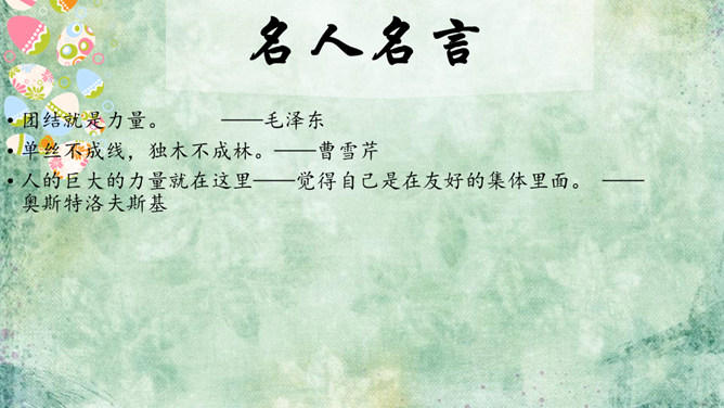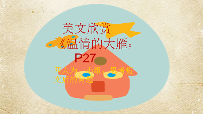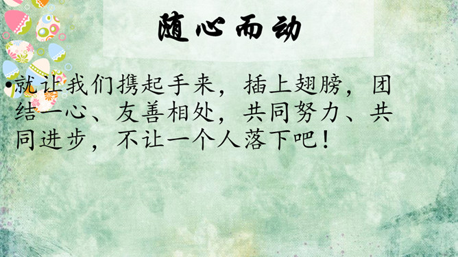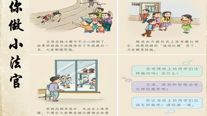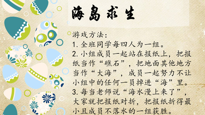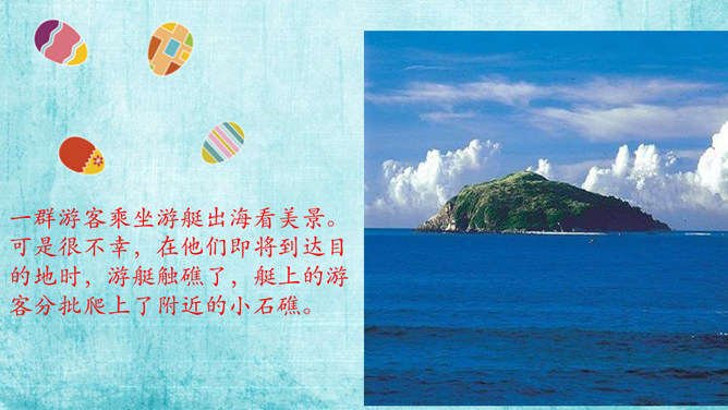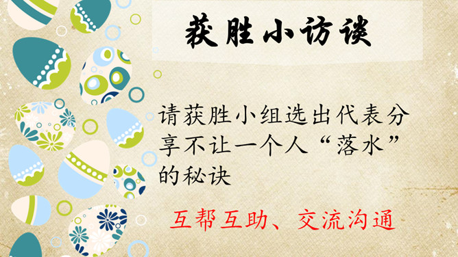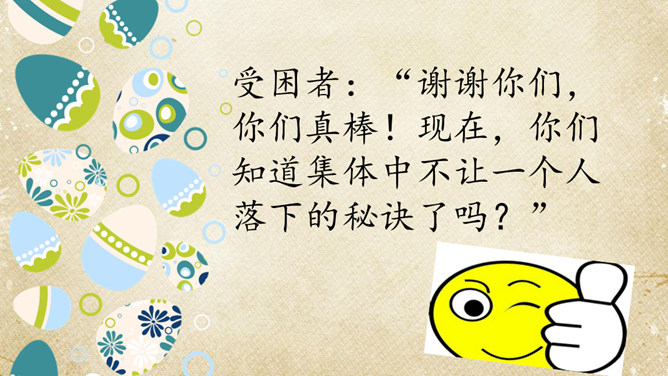 一群游客乘坐游艇出海看美景。可是很不幸,在他们即将到达目的地时,游艇触礁了,艇上的游客分批爬上了附近的小石礁。游戏方法:1.全班同学每四人为一组。2.小组成员一起站在报纸上,把报纸当作“礁石”,把地面其他地方当作“大海”,成员一起努力不让小组中的任何一员掉进“海”里。3.每当老师说“海水漫上来了”,大家就把报纸对折,把报纸折得最小且成员不落水的一组获胜。请获胜小组选出代表分享不让一个人“落水”的秘诀。互帮互助、交流沟通。受困者:“谢谢你们,你们真棒!现在,你们知道集体中不让一个人落下的秘诀了吗?”所属专题:同学相伴ppt。