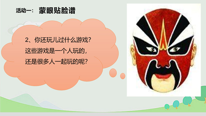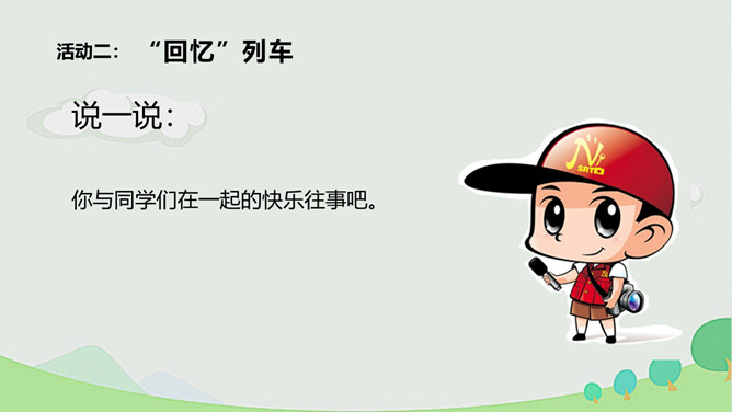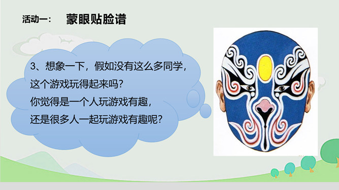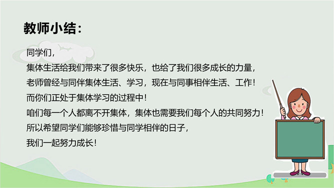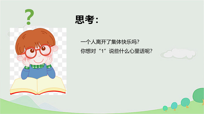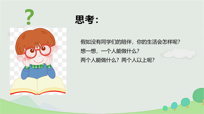 1、你觉得这个游戏好玩儿吗?为什么好玩儿?2、你还玩儿过什么游戏?这些游戏是一个人玩的,还是很多人一起玩的呢?3、想象一下,假如没有这么多同学,这个游戏玩得起来吗?你觉得是一个人玩游戏有趣,还是很多人一起玩游戏有趣呢?说一说:你与同学们在一起的快乐往事吧。思考:假如没有同学们的陪伴,你的生活会怎样呢?想一想,一个人能做什么?两个人能做什么?两个人以上呢?咱们每一个人都离不开集体,集体也需要我们每个人的共同努力!所以希望同学们能够珍惜与同学相伴的日子,我们一起努力成长!所属专题:同学相伴ppt。