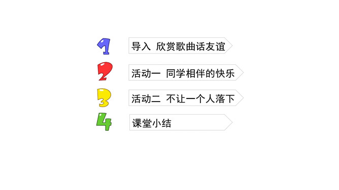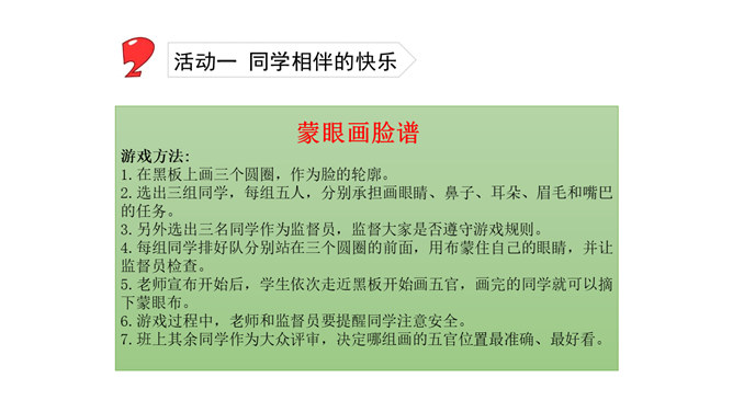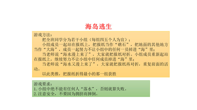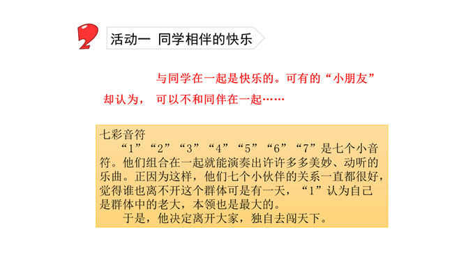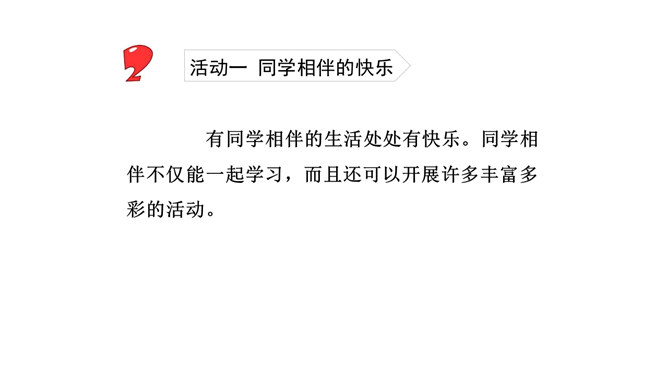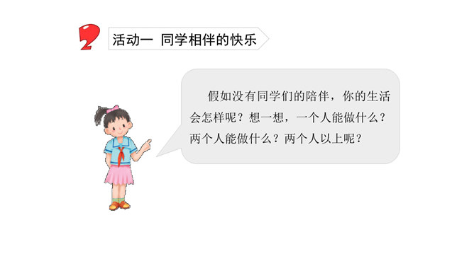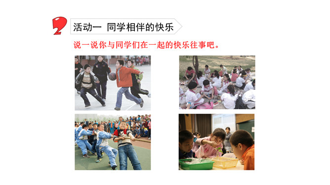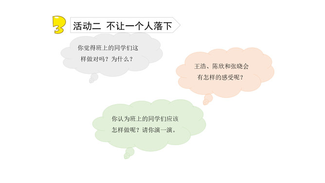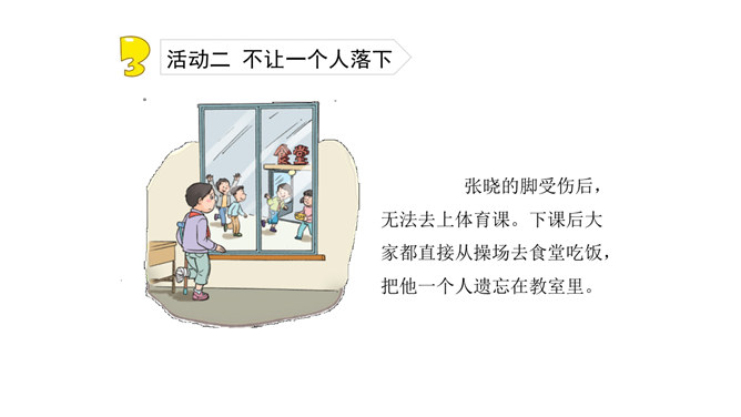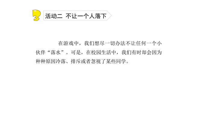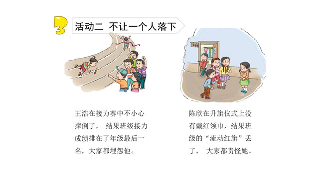 我们生活在同一个集体中,每个人或多或少都有自己的难处或不足,我们应当懂得体谅他人的心情与需要,学会关爱他人、互帮互助。我希望我们生活的集体是一个充满正能量的集体,每一个同学都是充满正能量的人。在游戏中,我们想尽一切办法不让任何一个小伙伴“落水”。可是,在校园生活中,我们有时却会因为种种原因冷落、排斥或者忽视了某些同学。王浩在接力赛中不小心摔倒了, 结果班级接力成绩排在了年级最后一名,大家都埋怨他。陈欣在升旗仪式上没有戴红领巾,结果班级的“流动红旗”丢了, 大家都责怪她。所属专题:同学相伴ppt。