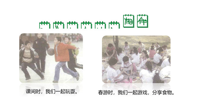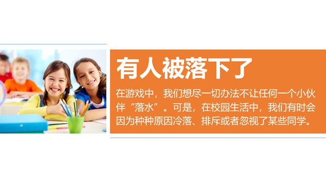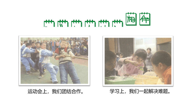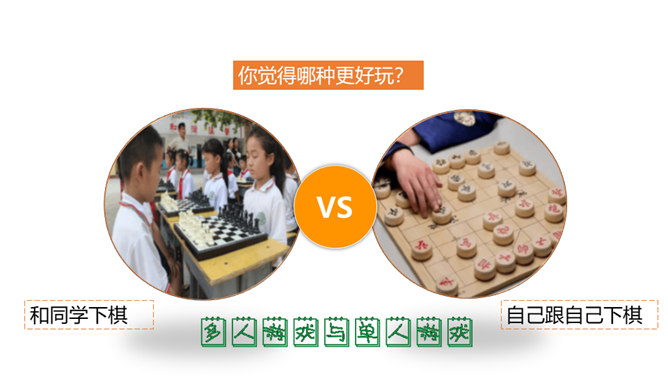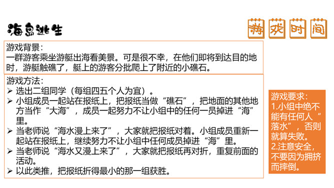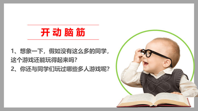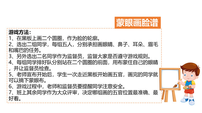 蒙眼画脸谱。游戏方法:1、在黑板上画二个圆圈,作为脸的轮廓。2、选出二组同学,每组五人,分别承担画眼睛、鼻子、耳朵、眉毛和嘴巴的任务。3、另外选出二名同学作为监督员,监督大家是否遵守游戏规则。4、每组同学排好队分别站在二个圆圈的前面,用布蒙住自己的眼睛,并让监督员检查。5、老师宣布开始后,学生一次走近黑板开始画五官,画完的同学就可以摘下蒙眼布。6、游戏过程中,老师和监督员要提醒同学注意安全。7、班上其余同学作为大众评审,决定哪组画的五官位置最准确、最好看。所属专题:同学相伴ppt。
