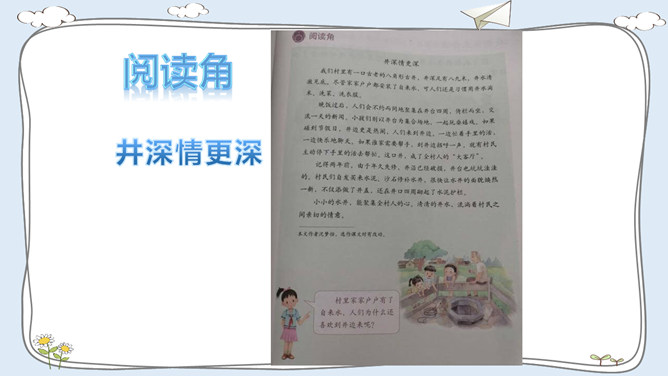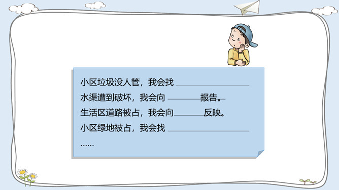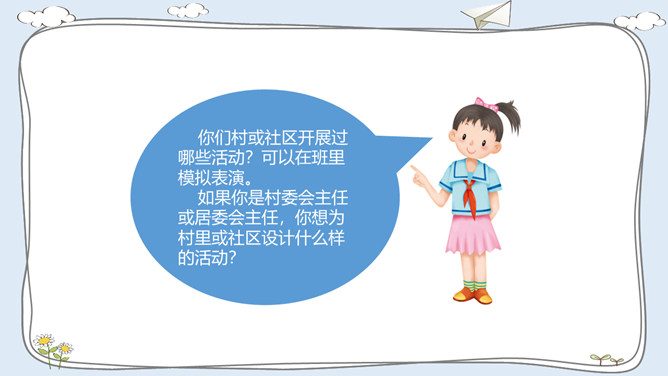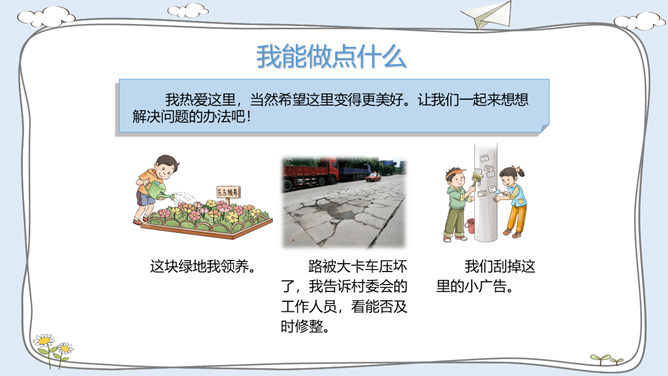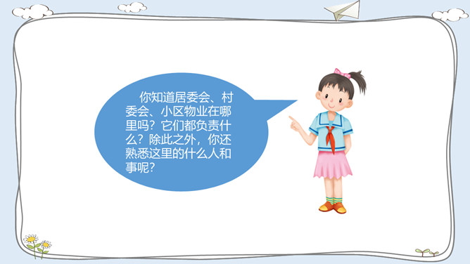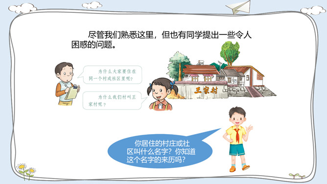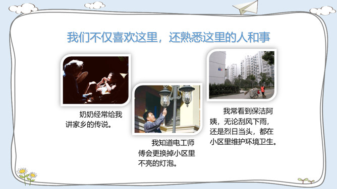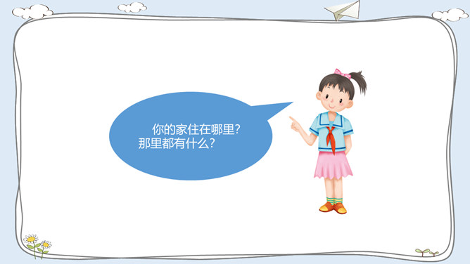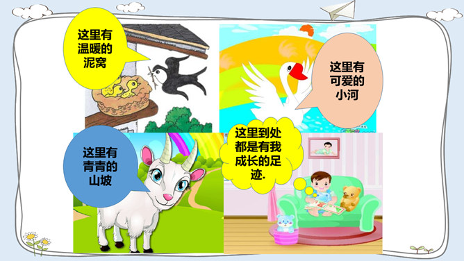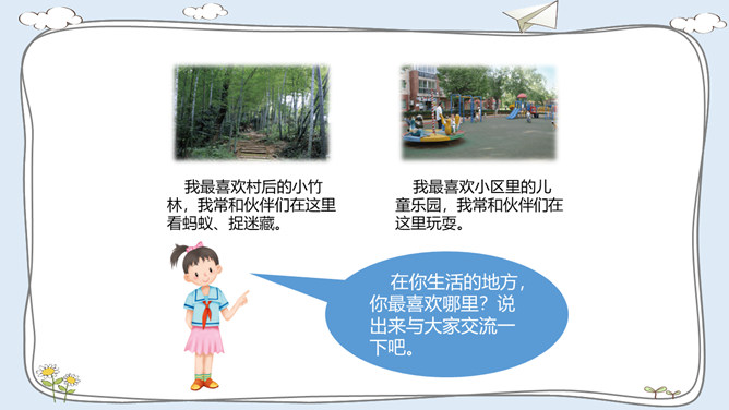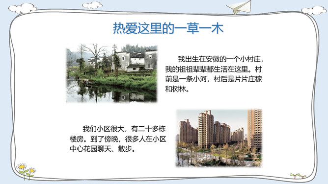 这里有温暖的泥窝、这里有可爱的小河、这里有青青的山坡,这里到处都是有我成长的足迹。我出生在安徽的一个小村庄,我的祖祖辈辈都生活在这里。村前是一条小河,村后是片片庄稼和树林。我们小区很大,有二十多栋楼房。到了傍晚,很多人在小区中心花园聊天、散步。你的家住在哪里?那里都有什么?我最喜欢村后的小竹林,我常和伙伴们在这里看蚂蚁、捉迷藏。我最喜欢小区里的儿童乐园,我常和伙伴们在这里玩耍。在你生活的地方,你最喜欢哪里?说出来与大家交流一下吧。所属专题:我的家在这里ppt。