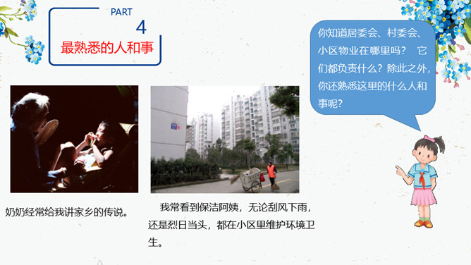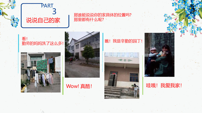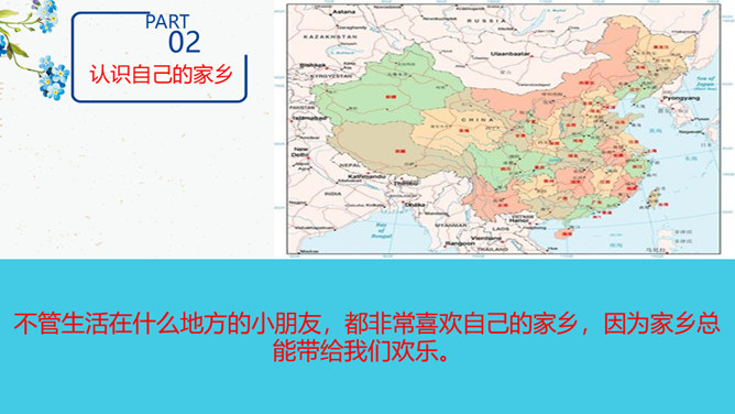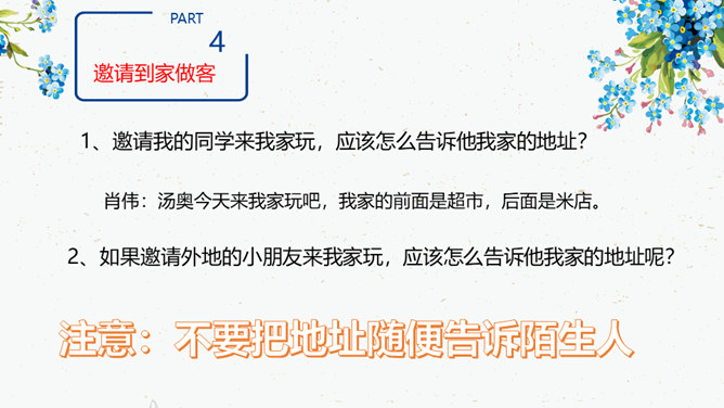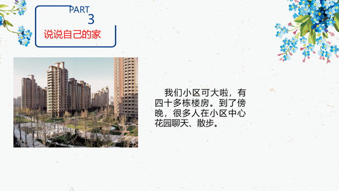 家是我们的居住的地方;是我们成长的地方;也是带给我们温暖的地方。你怎么知道这是你的家乡?你为你的家乡感到自豪吗?为什么?不管生活在什么地方的小朋友,都非常喜欢自己的家乡,因为家乡总能带给我们欢乐。我们小区可大啦,有四十多栋楼房。到了傍晚,很多人在小区中心花园聊天、散步。邀请我的同学来我家玩,应该怎么告诉他我家的地址?肖伟:汤奥今天来我家玩吧,我家的前面是超市,后面是米店。如果邀请外地的小朋友来我家玩,应该怎么告诉他我家的地址呢?注意:不要把地址随便告诉陌生人。所属专题:我的家在这里ppt。