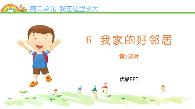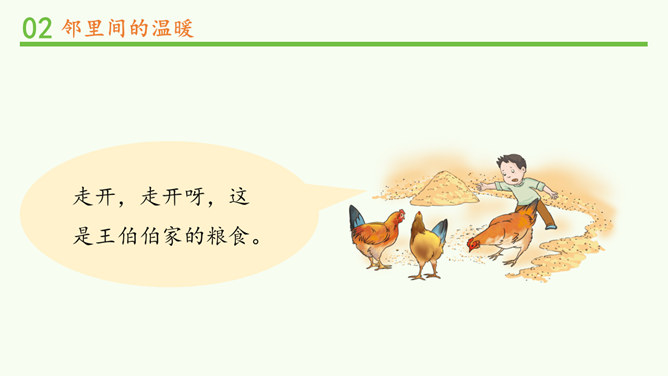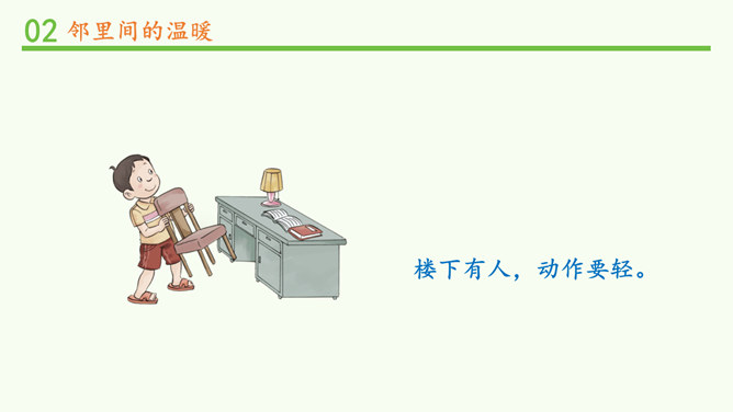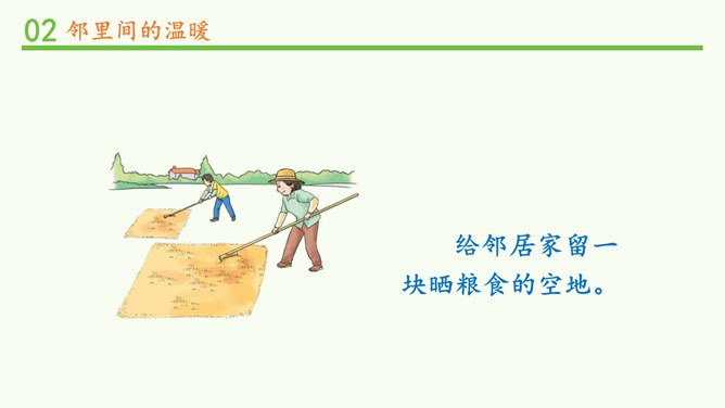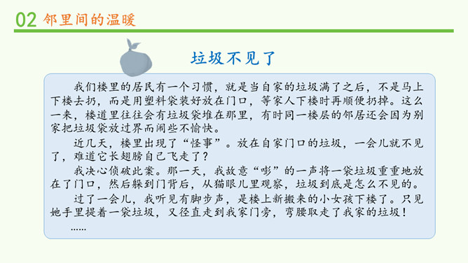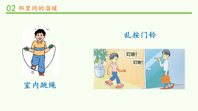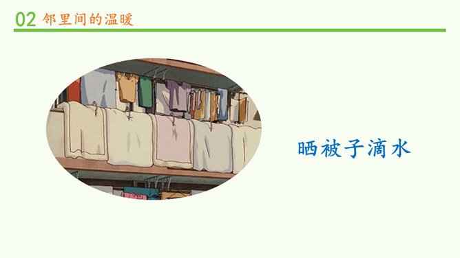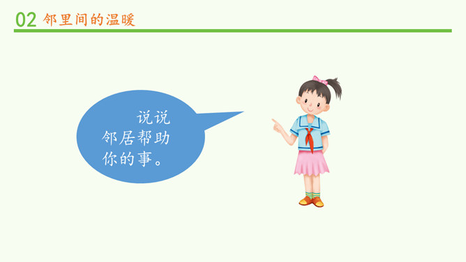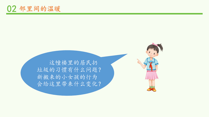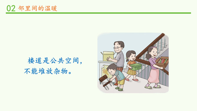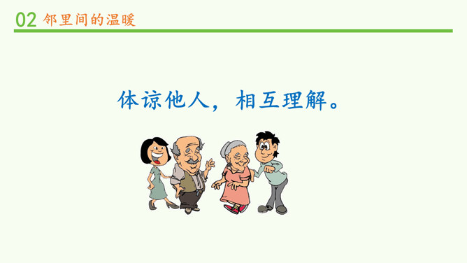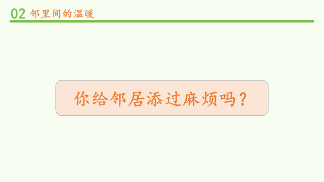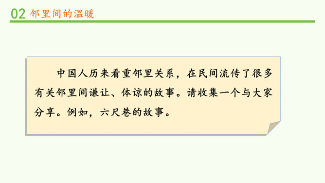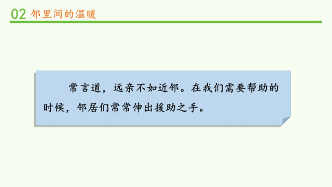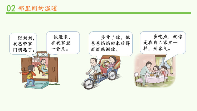 常言道,远亲不如近邻。在我们需要帮助的时候,邻居们常常伸出援助之手。张奶奶,我忘带家门钥匙了。快进来,在我家坐一会儿。多亏了你,他爸爸妈妈回来后得好好感谢你。多吃点,就像是在自己家里一样,别客气。说说邻居帮助你的事。你给邻居添过麻烦吗?这幢楼里的居民扔垃圾的习惯有什么问题?新搬来的小女孩的行为会给这里带来什么变化?中国人历来看重邻里关系,在民间流传了很多有关邻里间谦让、体谅的故事。请收集一个与大家分享。例如,六尺巷的故事。所属专题:我家的好邻居ppt。