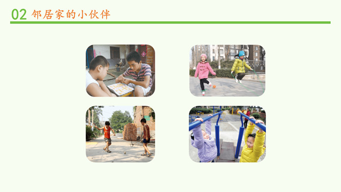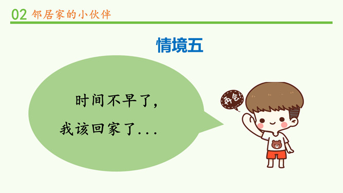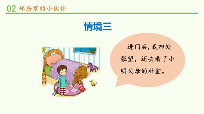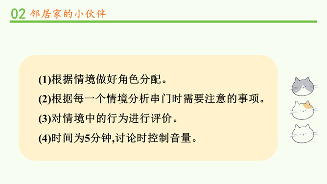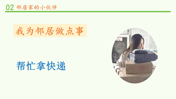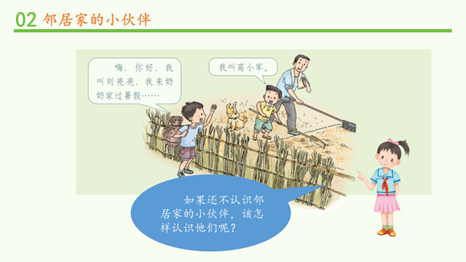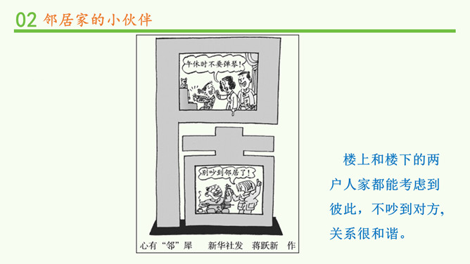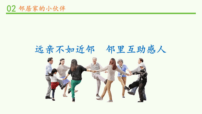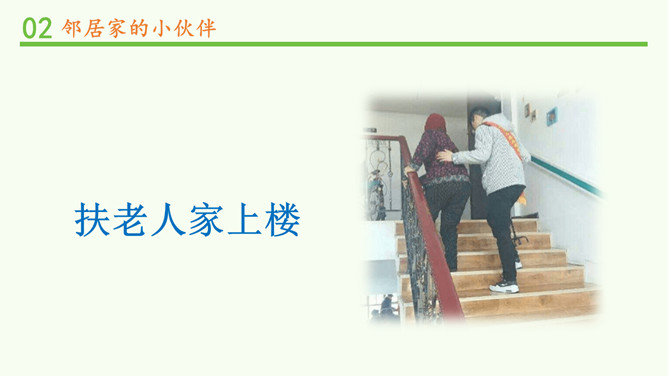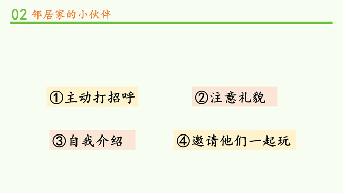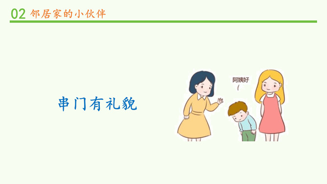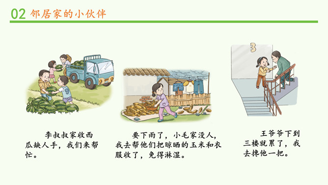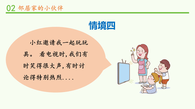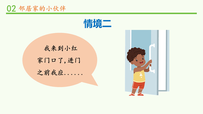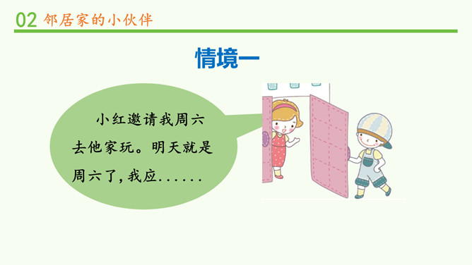 楼上和楼下的两户人家都能考虑到彼此,不吵到对方,关系很和谐。如果还不认识邻居家的小伙伴,该怎样认识他们呢?李叔叔家收西瓜缺人手,我们来帮忙。要下雨了,小毛家没人, 我去帮他们把晾晒的玉米和衣服收了,免得淋湿。王爷爷下到三楼就累了,我去搀他一把。(1)根据情境做好角色分配。(2)根据每一个情境分析串门时需要注意的事项。(3)对情境中的行为进行评价。(4)时间为5分钟,讨论时控制音量。小红邀请我周六去他家玩。明天就是周六了,我应......我来到小红家门口了,进门之前我应......所属专题:我家的好邻居ppt。