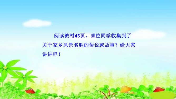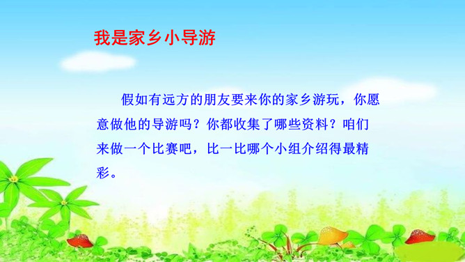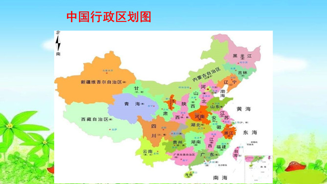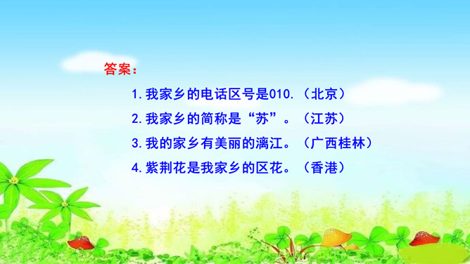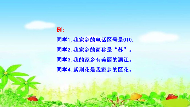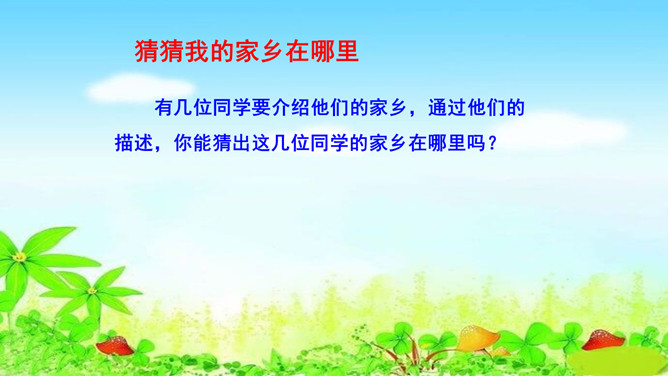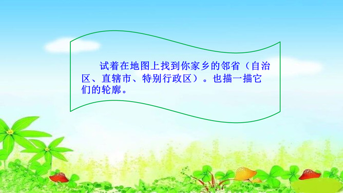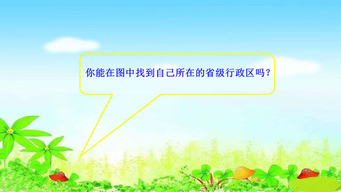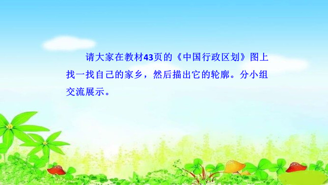 有几位同学要介绍他们的家乡,通过他们的描述,你能猜出这几位同学的家乡在哪里吗?例:同学1.我家乡的电话区号是010.同学2.我家乡的简称是“苏”。同学3.我的家乡有美丽的漓江。同学4.紫荆花是我家乡的区花。你能在图中找到自己所在的省级行政区吗?请大家在图上找一找自己的家乡,然后描出它的轮廓。分小组交流展示。试着在地图上找到你家乡的邻省。也描一描它们的轮廓。假如有远方的朋友要来你的家乡游玩,你愿意做他的导游吗?你都收集了哪些资料?咱们来做一个比赛吧,比一比哪个小组介绍得最精彩。所属专题:请到我的家乡来ppt。