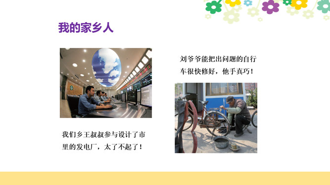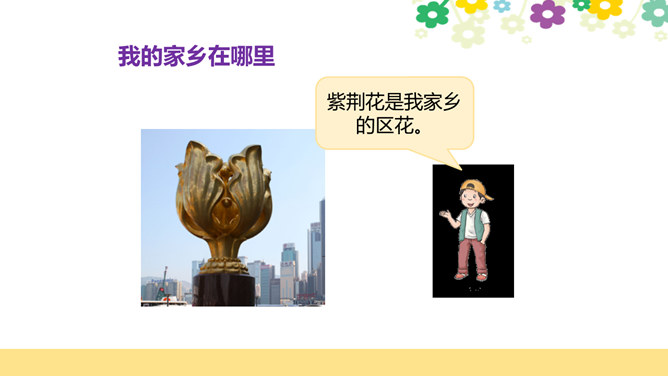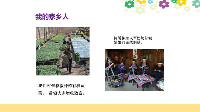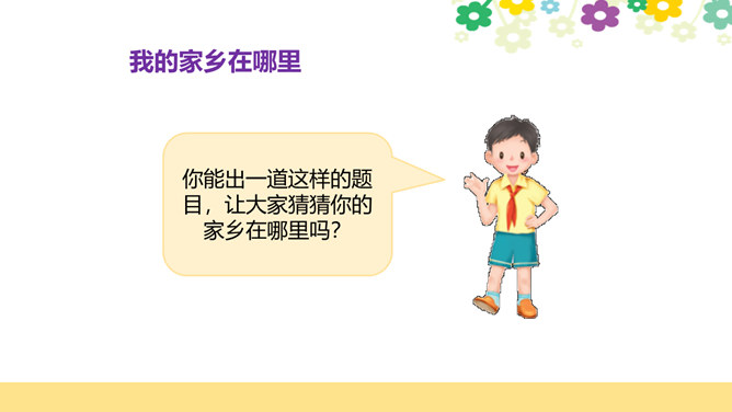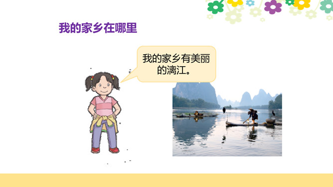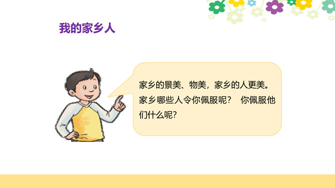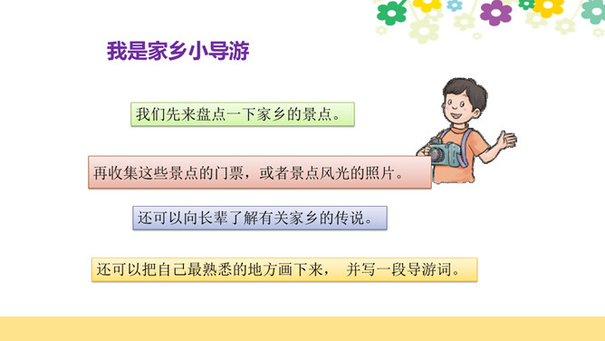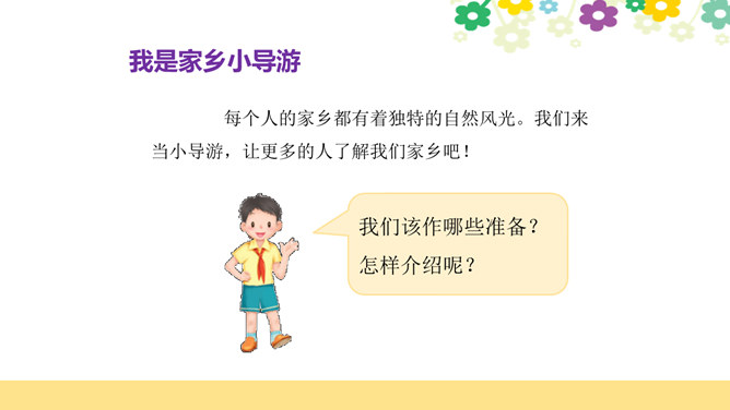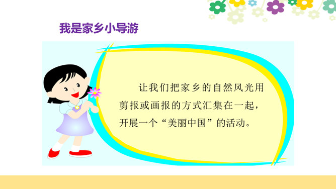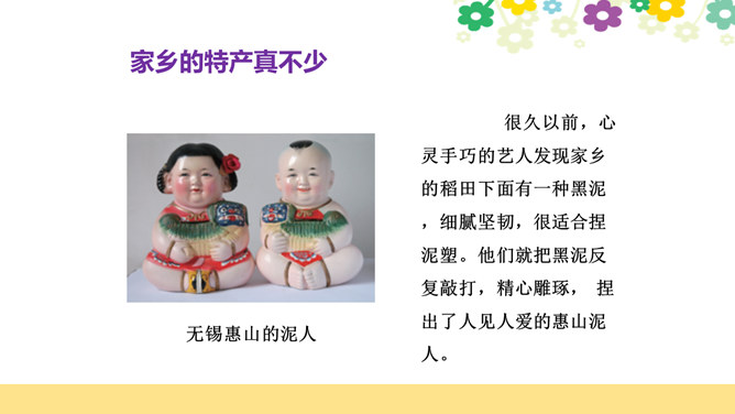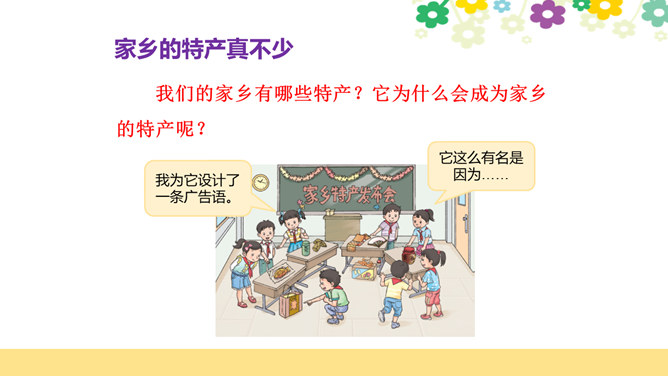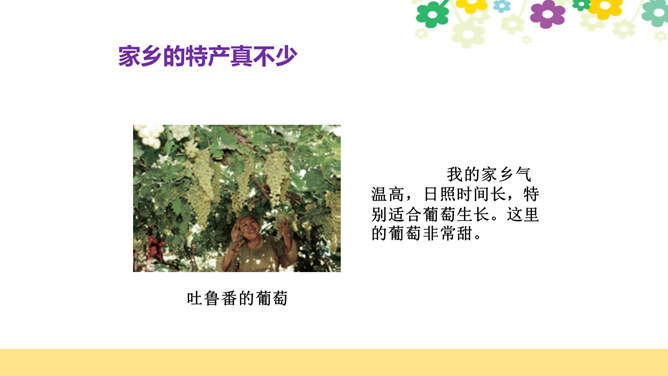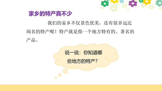 让我们把家乡的自然风光用剪报或画报的方式汇集在一起,开展一个“美丽中国”的活动。我们的家乡不仅景色优美,还有很多远近闻名的特产呢!特产就是指一个地方特有的、著名的产品。说一说:你知道哪些地方的特产?我的家乡气温高,日照时间长,特别适合葡萄生长。这里的葡萄非常甜。很久以前,心灵手巧的艺人发现家乡的稻田下面有一种黑泥,细腻坚韧,很适合捏泥塑。他们就把黑泥反复敲打,精心雕琢, 捏出了人见人爱的惠山泥人。我们的家乡有哪些特产?它为什么会成为家乡的特产呢?所属专题:请到我的家乡来ppt。
