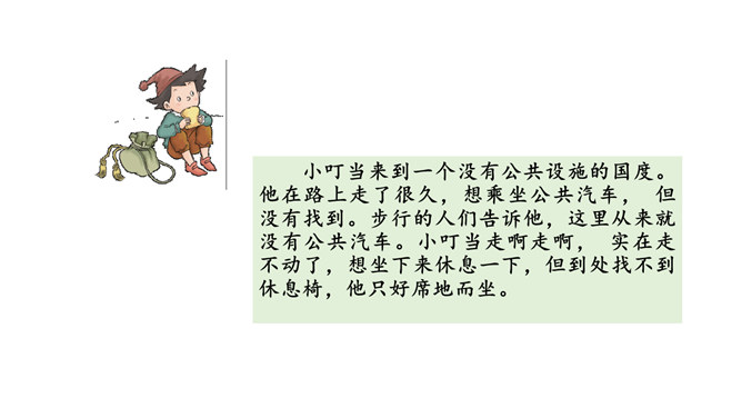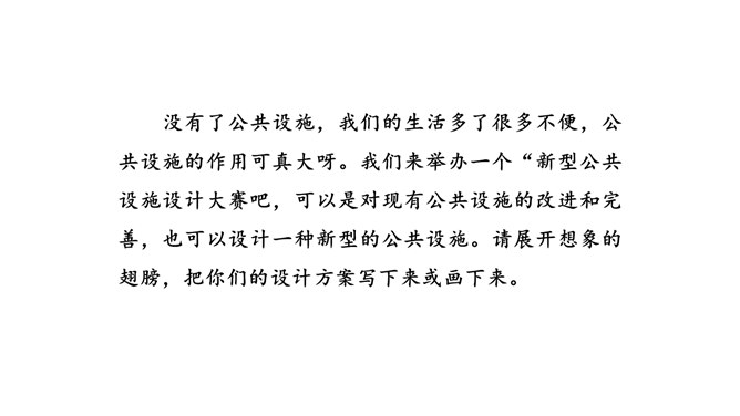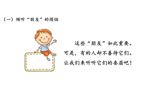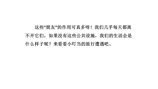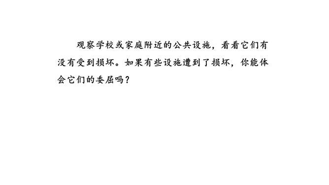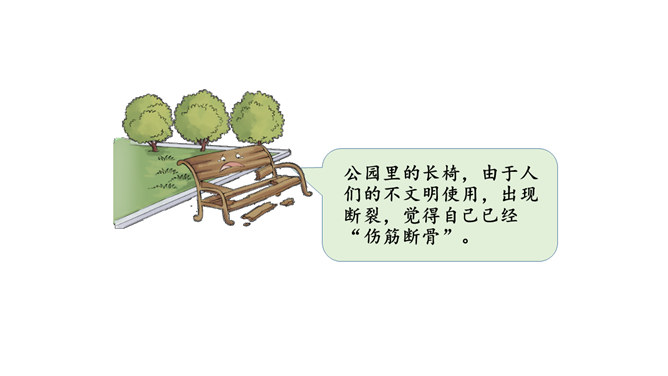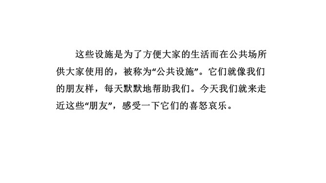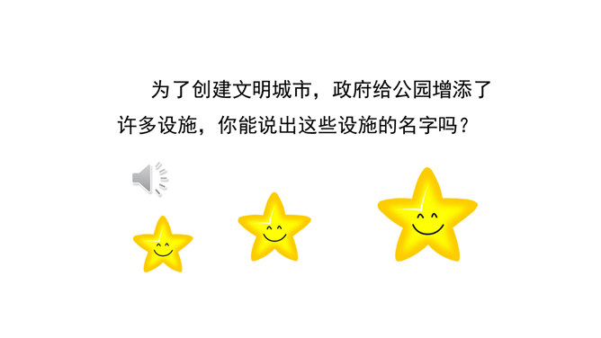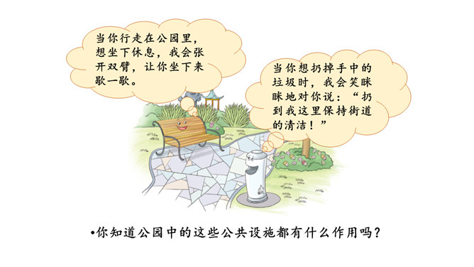 大家知道这是什么地方吗?你看到了什么?为了创建文明城市,政府给公园增添了许多设施,你能说出这些设施的名字吗?这些设施是为了方便大家的生活而在公共场所供大家使用的,被称为“公共设施”。它们就像我们的朋友样,每天默默地帮助我们。今天我们就来走近这些“朋友”,感受一下它们的喜怒哀乐。当你行走在公园里,想坐下休息,我会张开双臂,让你坐下来歇一歇。当你想扔掉手中的垃圾时,我会笑眯眯地对你说:“扔到我这里保持街道的清洁!”你知道公园中的这些公共设施都有什么作用吗?所属专题:大家的朋友ppt。