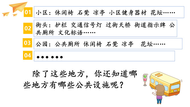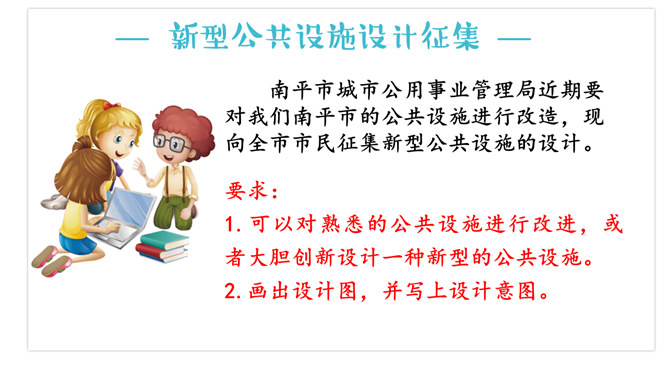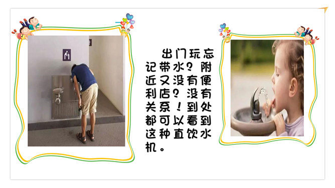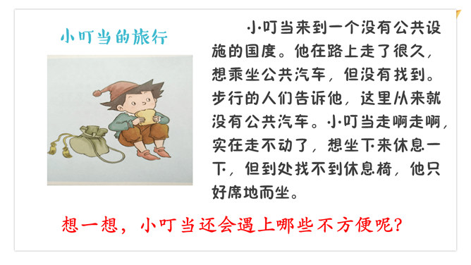 小叮当来到一个没有公共设施的国度。他在路上走了很久,想乘坐公共汽车,但没有找到。步行的人们告诉他,这里从来就没有公共汽车。小叮当走啊走啊,实在走不动了,想坐下来休息一下,但到处找不到休息椅,他只好席地而坐。想一想,小叮当还会遇上哪些不方便呢?出门玩忘记带水?附近又没有便利店?没有关系!到处都可以看到这种直饮水机。很多红绿灯杆上都装有阅卡器,老年人或残疾人只要把卡轻触阅卡器,就可以延长绿灯的时间,从容地通过马路。向爸爸妈妈介绍你的设计作品。所属专题:大家的朋友ppt。