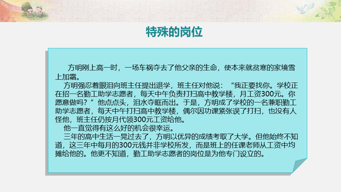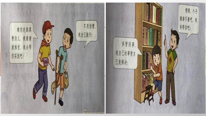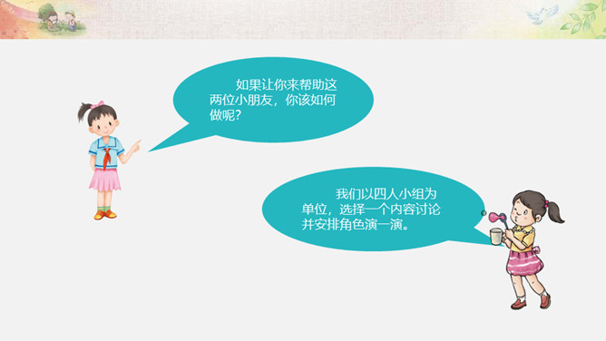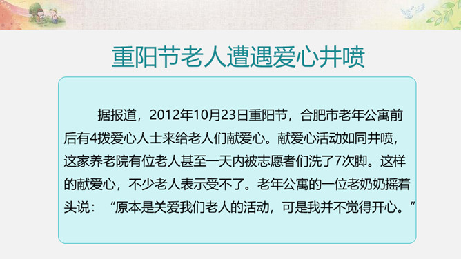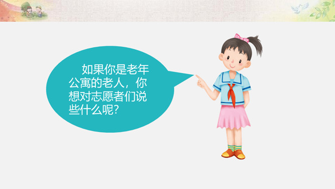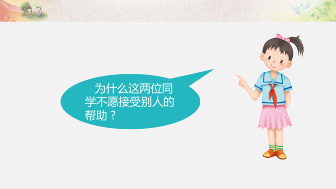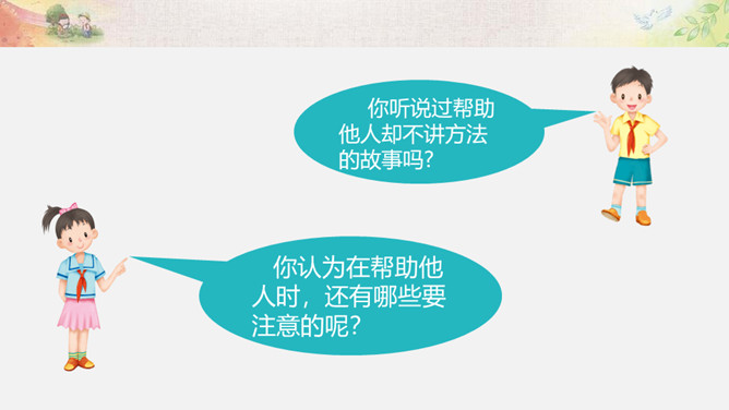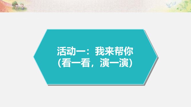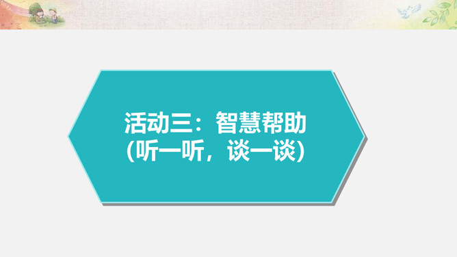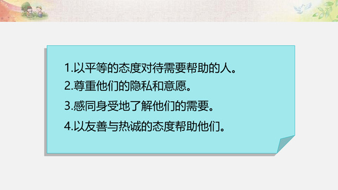 活动一:我来帮你(看一看,演一演)为什么这两位同学不愿接受别人的帮助?如果让你来帮助这两位小朋友,你该如何做呢?我们以四人小组为单位,选择一个内容讨论并安排角色演一演。活动二:用心了解(播一播,访一访)如果你是老年公寓的老人,你想对志愿者们说些什么呢?你听说过帮助他人却不讲方法的故事吗? 你认为在帮助他人时,还有哪些要注意的呢?活动三:智慧帮助(听一听,谈一谈)1.以平等的态度对待需要帮助的人。2.尊重他们的隐私和意愿。3.感同身受地了解他们的需要。4.以友善与热诚的态度帮助他们。所属专题:爱心的传递者ppt。