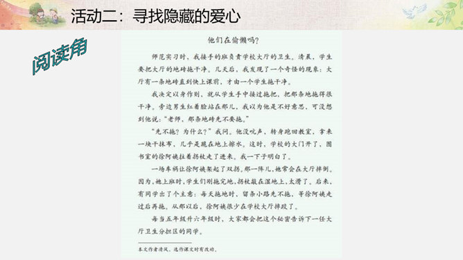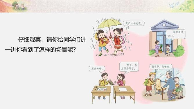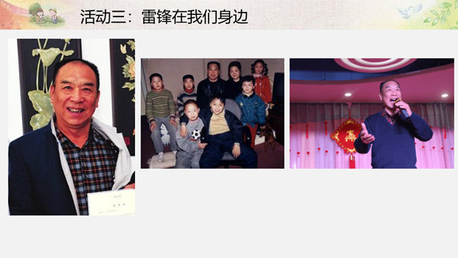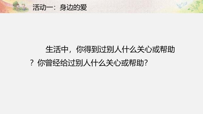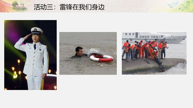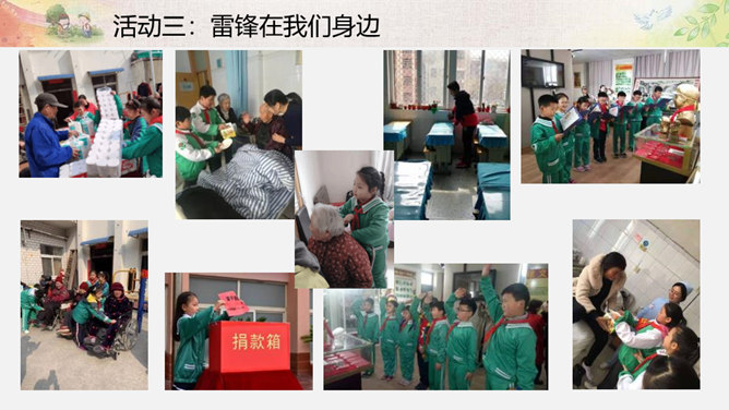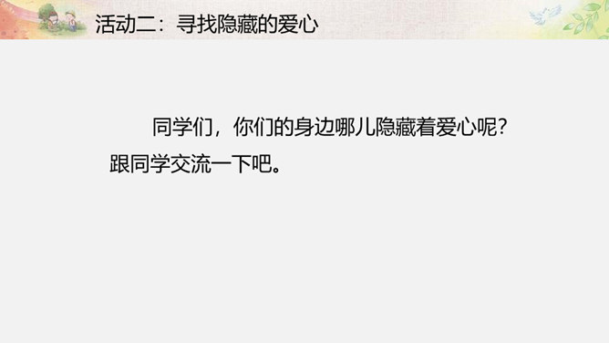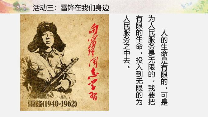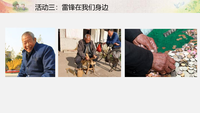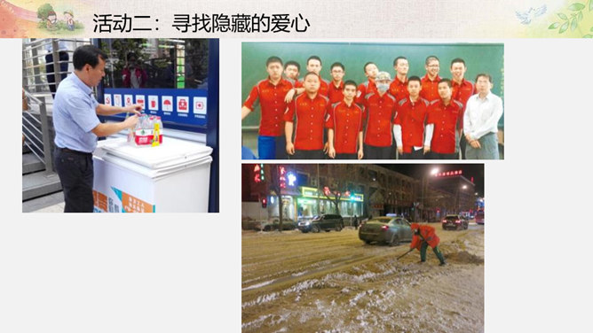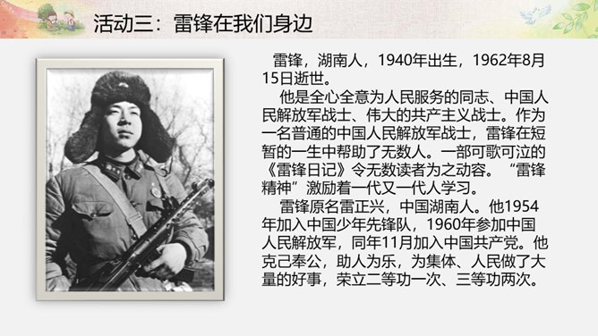 仔细观察,请你给同学们讲一讲你看到了怎样的场景呢?活动一:身边的爱。生活中,你得到过别人什么关心或帮助?你曾经给过别人什么关心或帮助?活动二:寻找隐藏的爱心。同学们,你们的身边哪儿隐藏着爱心呢?跟同学交流一下吧。活动三:雷锋在我们身边。雷锋,湖南人,1940年出生,1962年8月15日逝世。他是全心全意为人民服务的同志、中国人民解放军战士、伟大的共产主义战士。作为一名普通的中国人民解放军战士,雷锋在短暂的一生中帮助了无数人。一部可歌可泣的《雷锋日记》令无数读者为之动容。“雷锋精神”激励着一代又一代人学习。所属专题:爱心的传递者ppt。