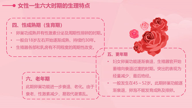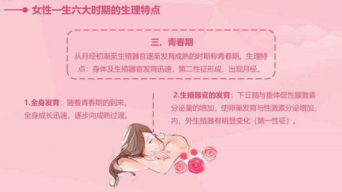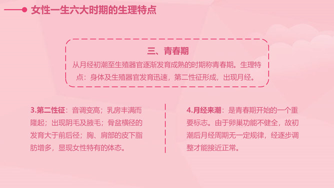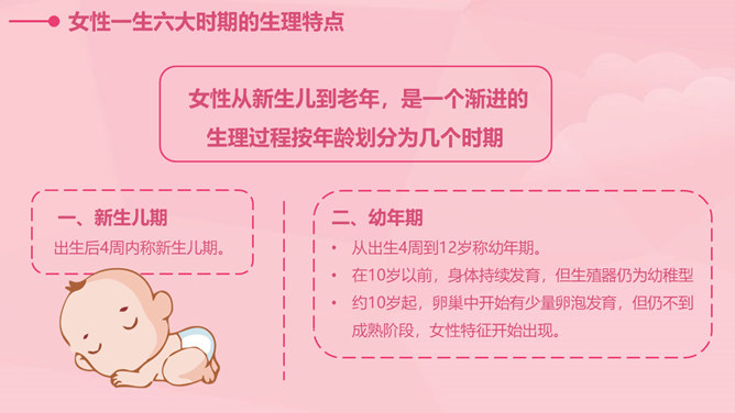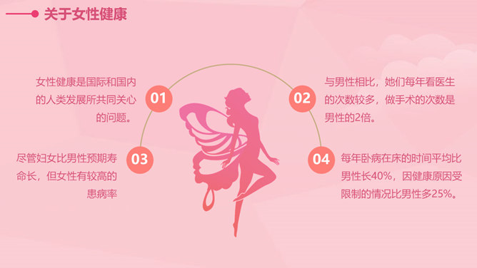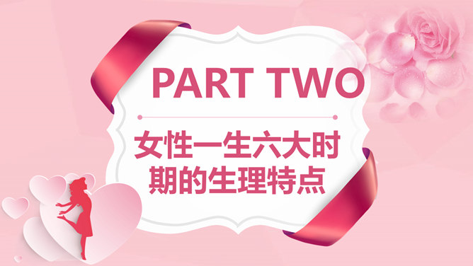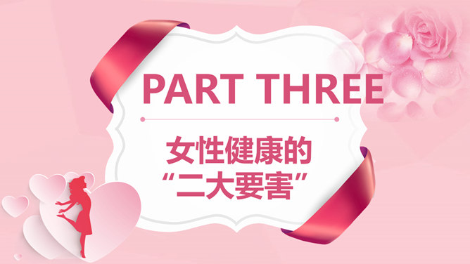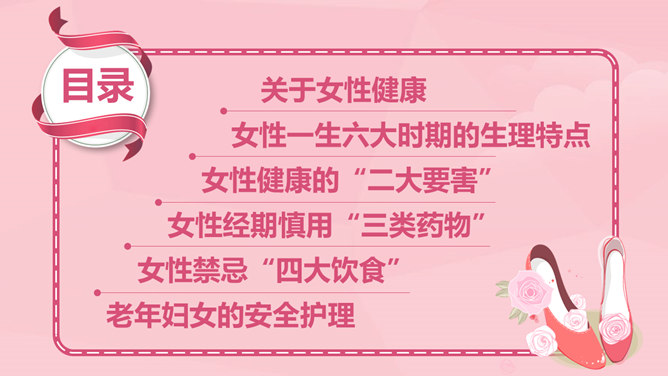 女人女性健康知识PPT模板。关于女性健康、女性一生六大时期的生理特点、女性健康的“二大要害” 、女性经期慎用“三类药物” 、女性禁忌“四大饮食”、老年妇女的安全护理。