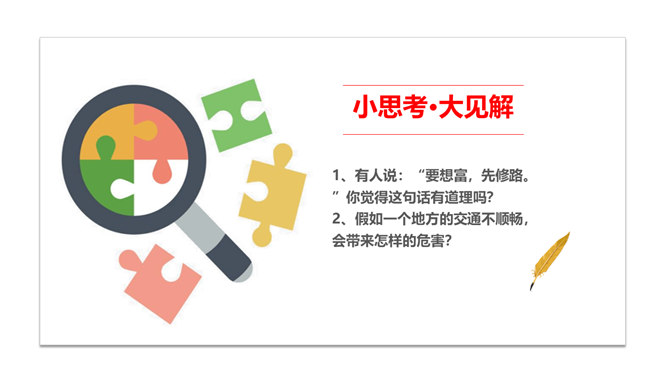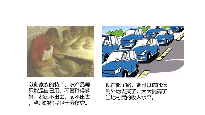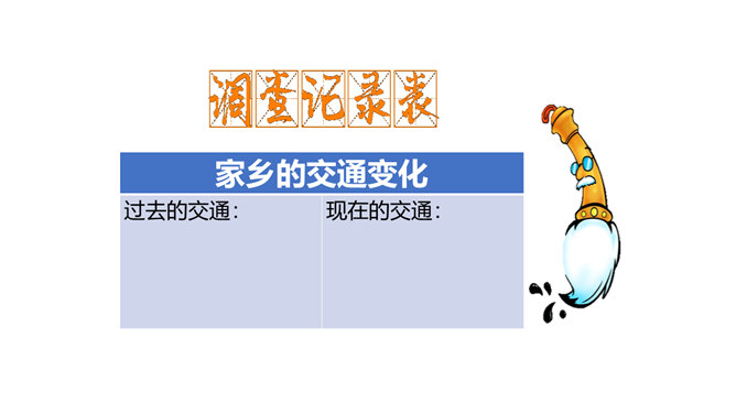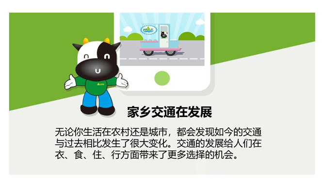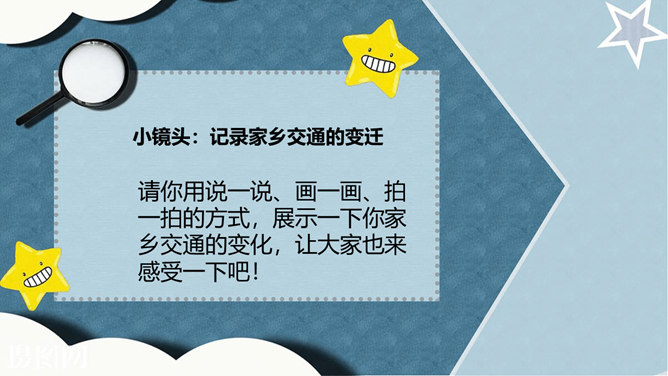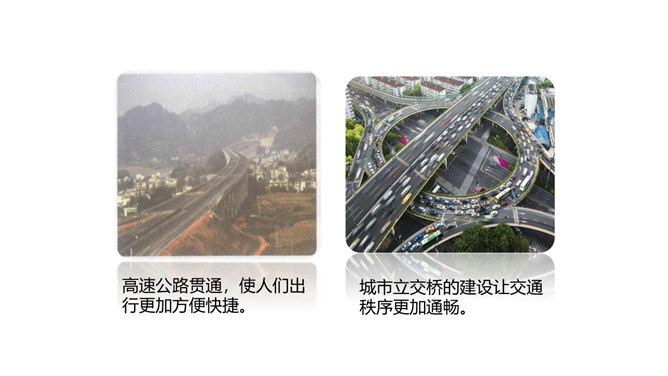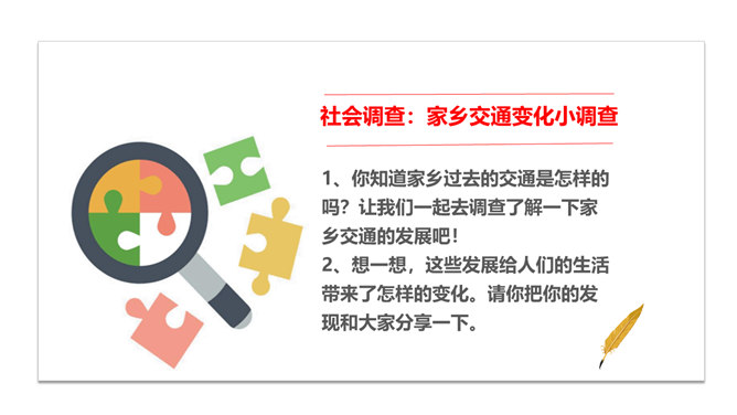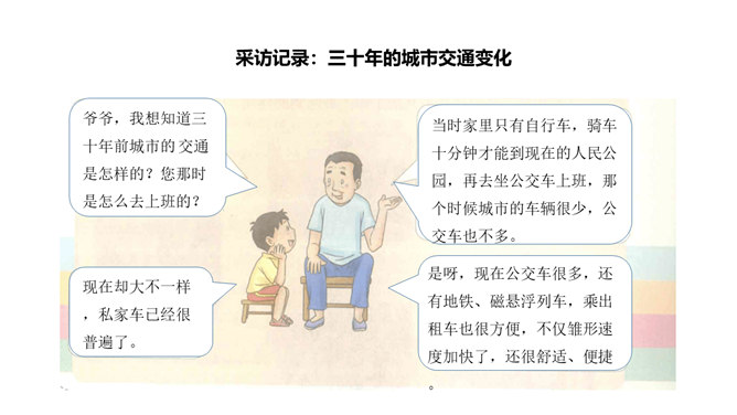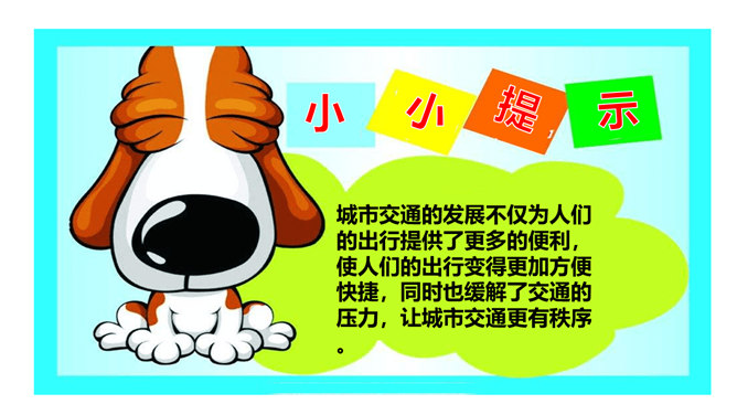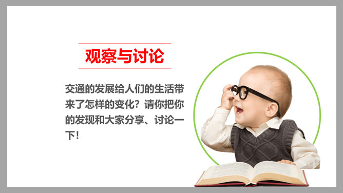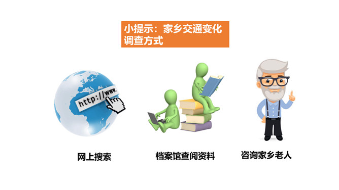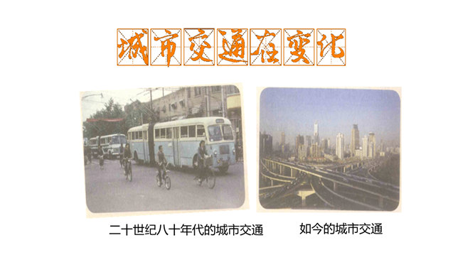 无论你生活在农村还是城市,都会发现如今的交通与过去相比发生了很大变化。交通的发展给人们在衣、食、住、行方面带来了更多选择的机会。社会调查:家乡交通变化小调查。1、你知道家乡过去的交通是怎样的吗?让我们一起去调查了解一下家乡交通的发展吧!2、想一想,这些发展给人们的生活带来了怎样的变化。请你把你的发现和大家分享一下。请你用说一说、画一画、拍一拍的方式,展示一下你家乡交通的变化,让大家也来感受一下吧!交通的发展给人们的生活带来了怎样的变化?请你把你的发现和大家分享、讨论一下!所属专题:四通八达的交通ppt。