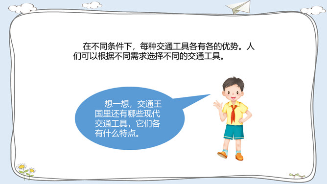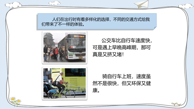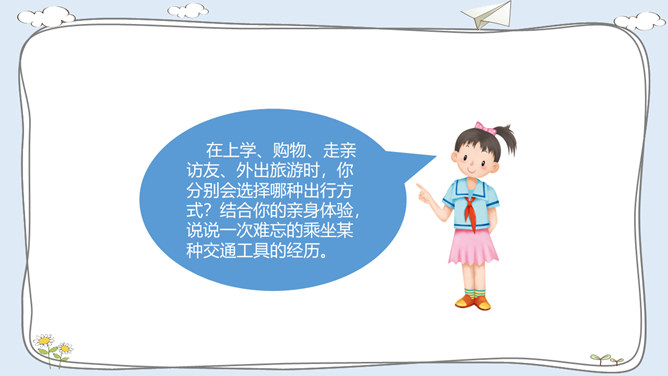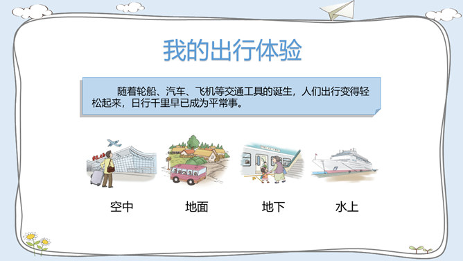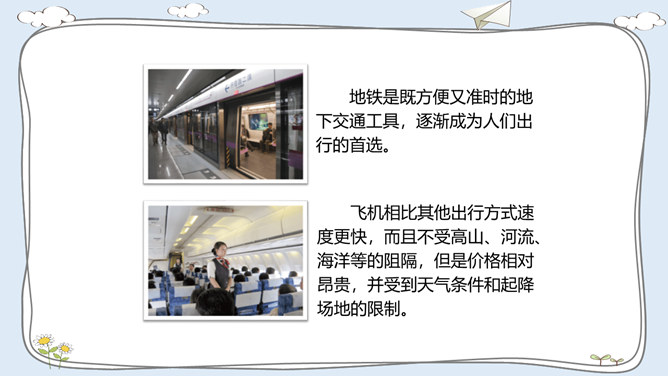 随着轮船、汽车、飞机等交通工具的诞生,人们出行变得轻松起来,日行千里早已成为平常事。在上学、购物、走亲访友、外出旅游时,你分别会选择哪种出行方式?结合你的亲身体验,说说一次难忘的乘坐某种交通工具的经历。人们在出行时有着多样化的选择,不同的交通方式给我们带来了不一样的体验。飞机相比其他出行方式速度更快,而且不受高山、河流、海洋等的阻隔,但是价格相对昂贵,并受到天气条件和起降场地的限制。地铁是既方便又准时的地下交通工具,逐渐成为人们出行的首选。所属专题:四通八达的交通ppt。