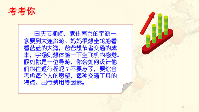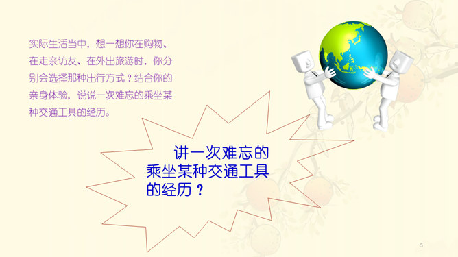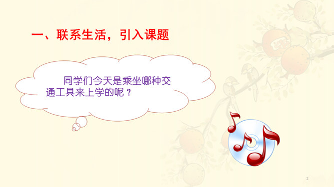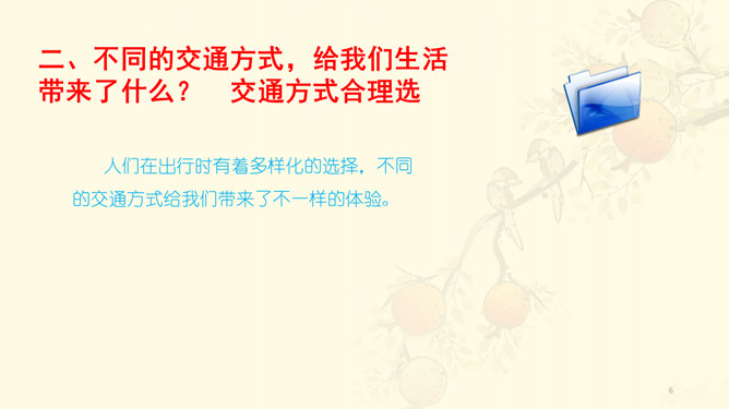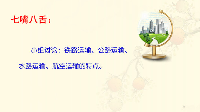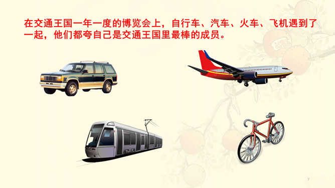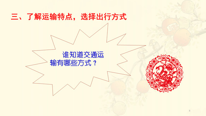 一、联系生活,引入课题。同学们今天是乘坐哪种交通工具来上学的呢?讲一次难忘的乘坐某种交通工具的经历。二、不同的交通方式,给我们生活带来了什么?交通方式合理选。人们在出行时有着多样化的选择,不同的交通方式给我们带来了不一样的体验。在交通王国一年一度的博览会上,自行车、汽车、火车、飞机遇到了一起,他们都夸自己是交通王国里最棒的成员。三、了解运输特点,选择出行方式。谁知道交通运输有哪些方式?小组讨论:铁路运输、公路运输、水路运输、航空运输的特点。所属专题:四通八达的交通ppt。