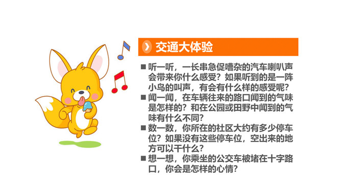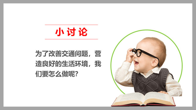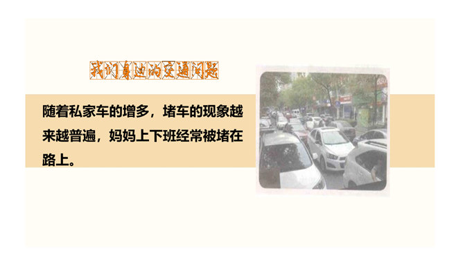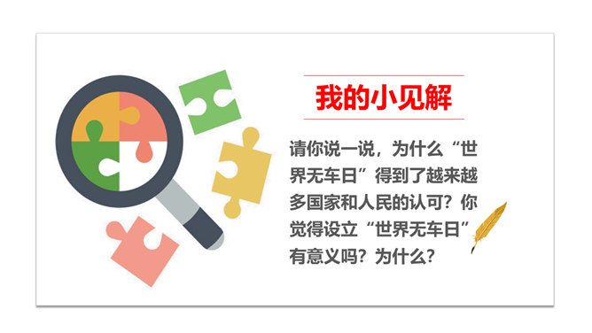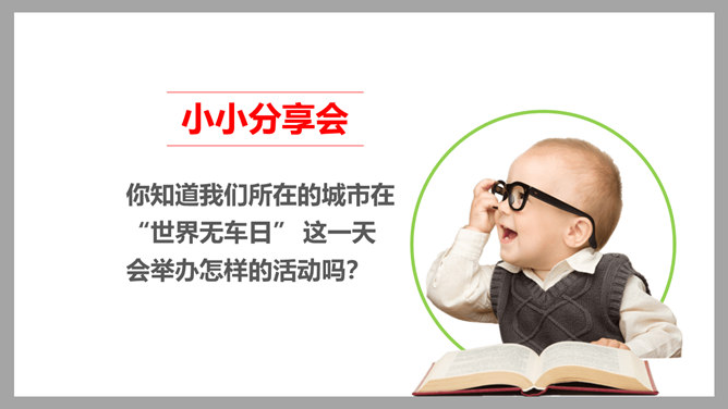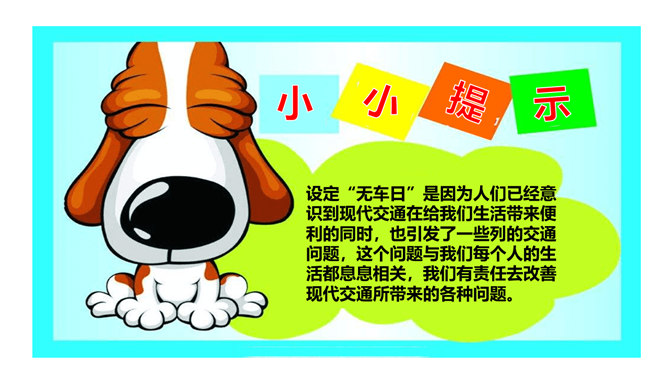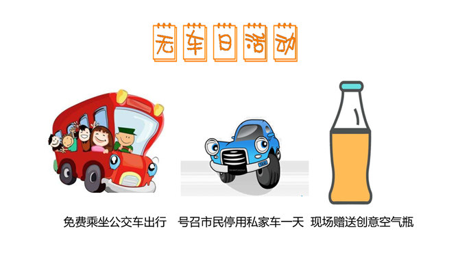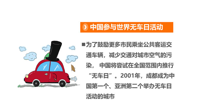 为了鼓励更多市民乘坐公共客运交通车辆,减少交通对城市空气的污染, 中国将尝试在全国范围内推行“无车日”。2001年,成都成为中国第一个、亚洲第二个举办无车日活动的城市。你知道我们所在的城市在“世界无车日” 这一天会举办怎样的活动吗?请你说一说,为什么“世界无车日”得到了越来越多国家和人民的认可?你觉得设立“世界无车日”有意义吗?为什么?设定“无车日”是因为人们已经意识到现代交通在给我们生活带来便利的同时,也引发了一些列的交通问题,这个问题与我们每个人的生活都息息相关,我们有责任去改善现代交通所带来的各种问题。所属专题:慧眼看交通ppt。