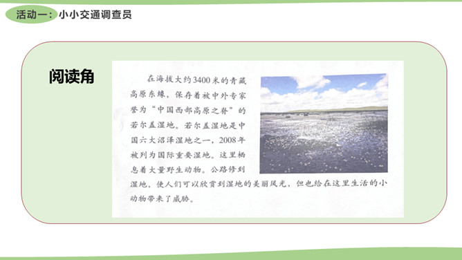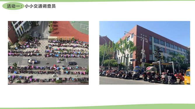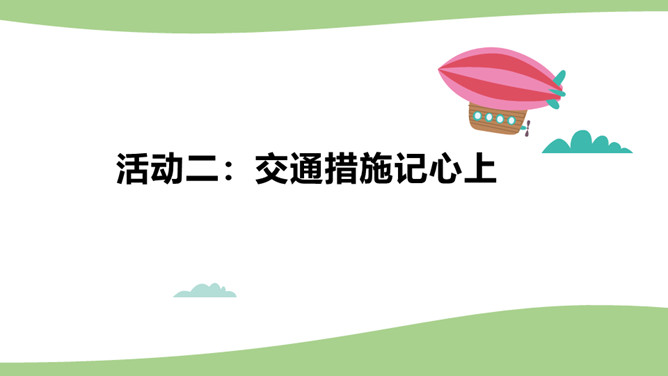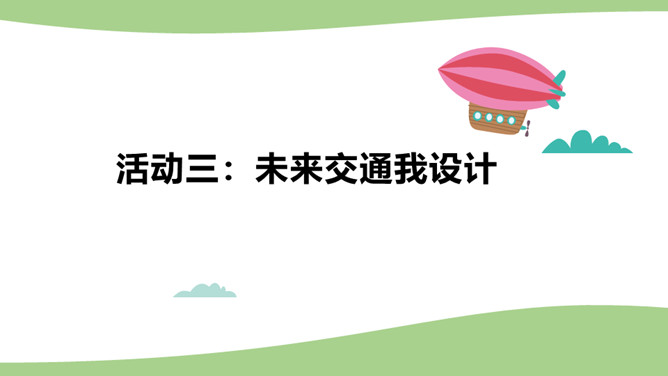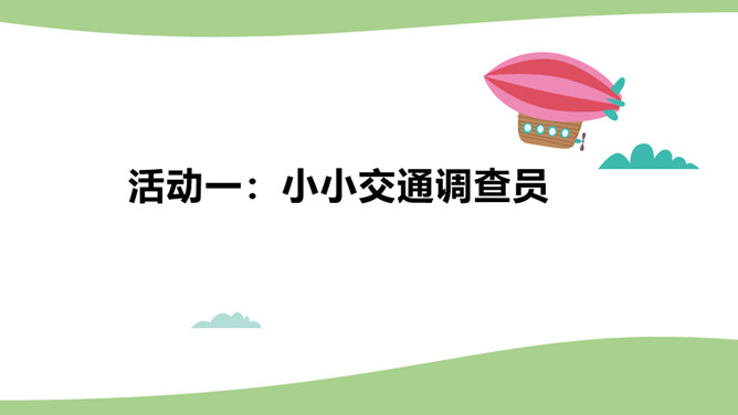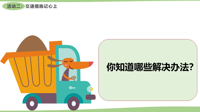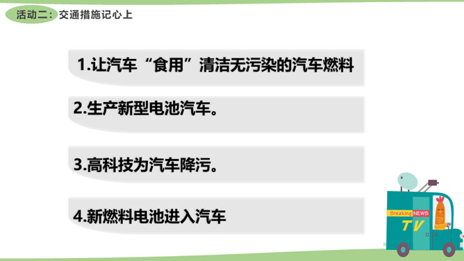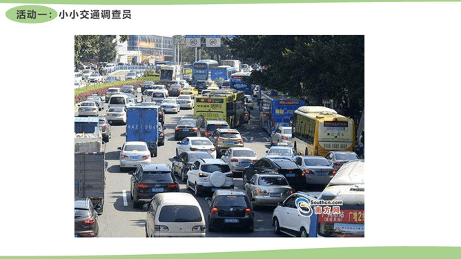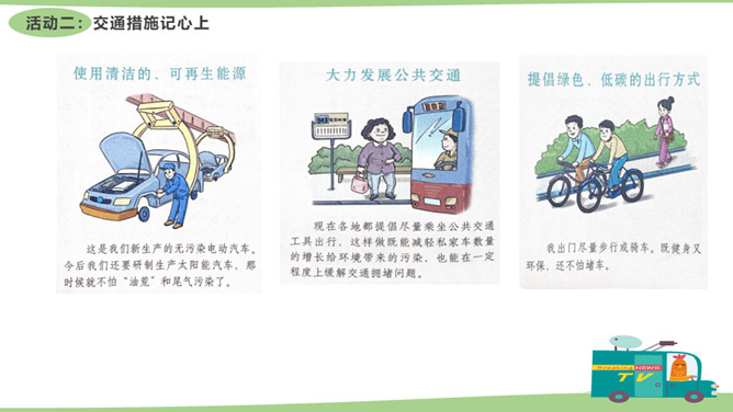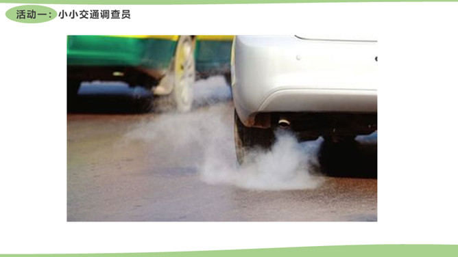 活动一:小小交通调查员。活动二:交通措施记心上。你知道哪些解决办法?1.让汽车“食用”清洁无污染的汽车燃料。2.生产新型电池汽车。3.高科技为汽车降污。4.新燃料电池进入汽车。活动三:未来交通我设计。欣赏一下同学们的设计,给他们评一评吧。所属专题:慧眼看交通ppt。