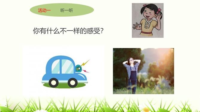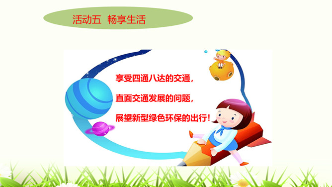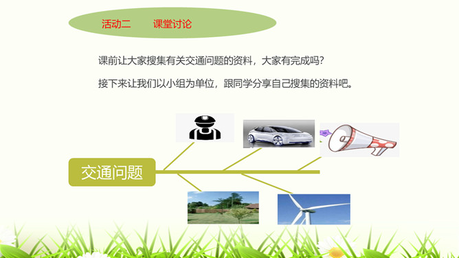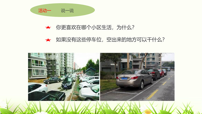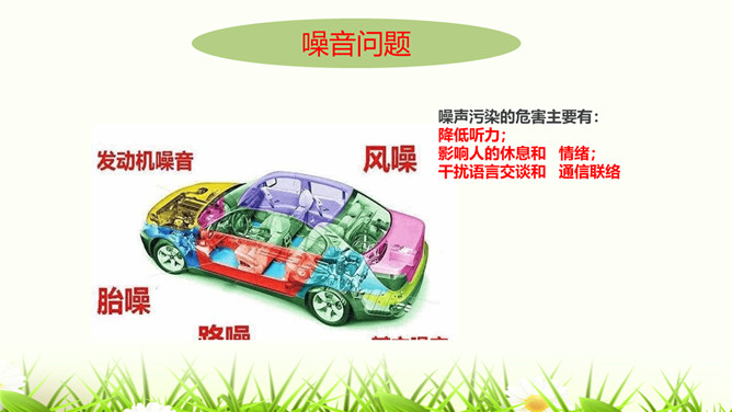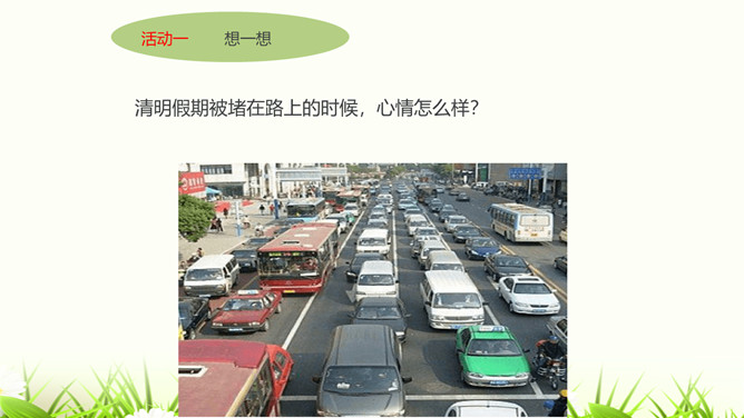 你有什么不一样的感受?花香!尾气?你更喜欢在哪个小区生活,为什么?如果没有这些停车位,空出来的地方可以干什么?清明假期被堵在路上的时候,心情怎么样?课前让大家搜集有关交通问题的资料,大家有完成吗?接下来让我们以小组为单位,跟同学分享自己搜集的资料吧。噪声污染的危害主要有:降低听力;影响人的休息和情绪;干扰语言交谈和通信联络。享受四通八达的交通,直面交通发展的问题,展望新型绿色环保的出行!所属专题:慧眼看交通ppt。
