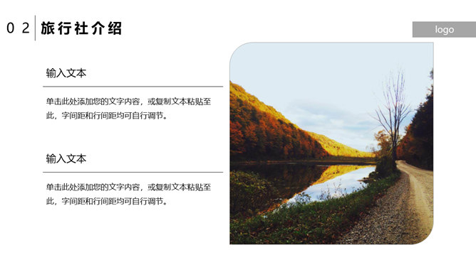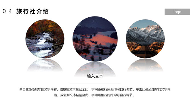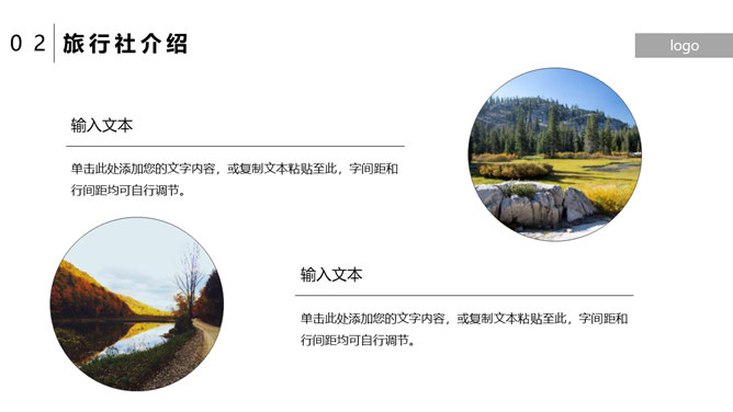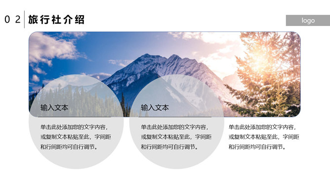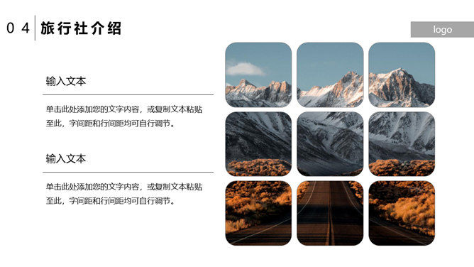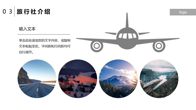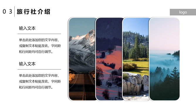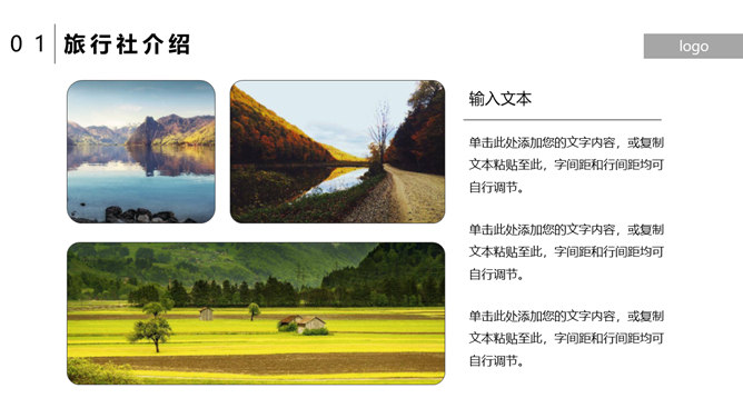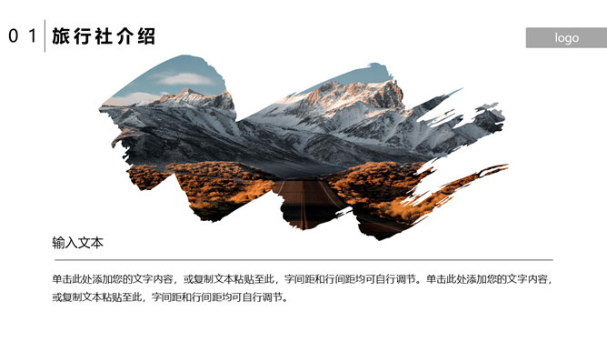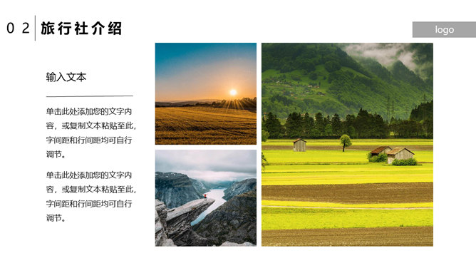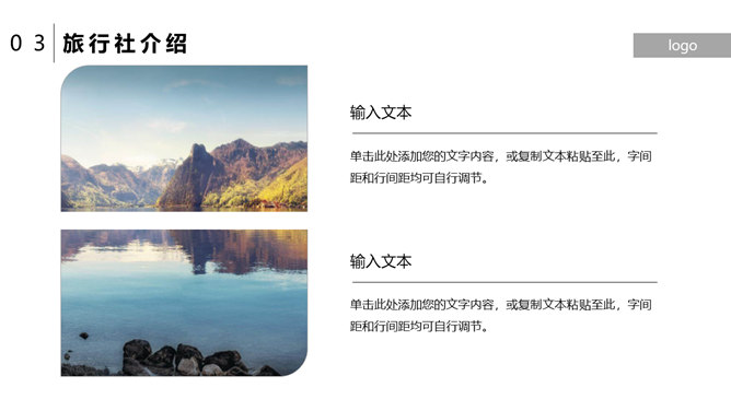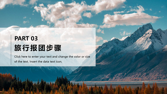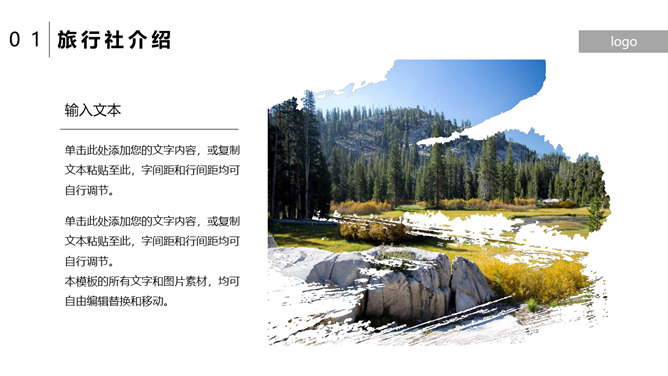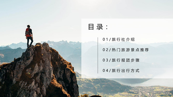 旅行社旅游景点介绍PPT模板。一套旅游景点、自然风景介绍幻灯片模板,图文排版页面为主,适合旅行社行程介绍。