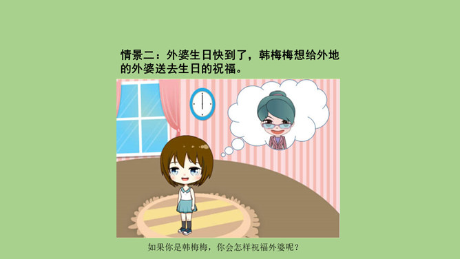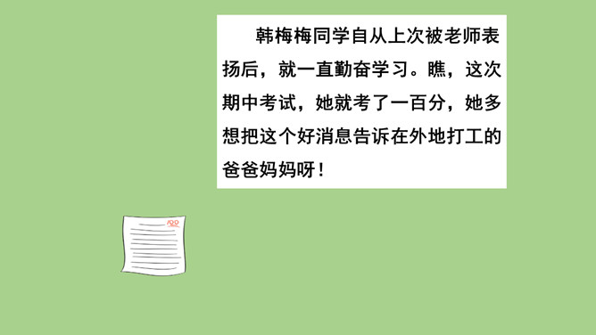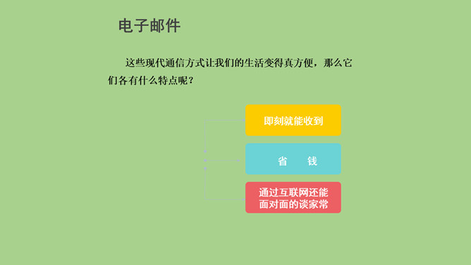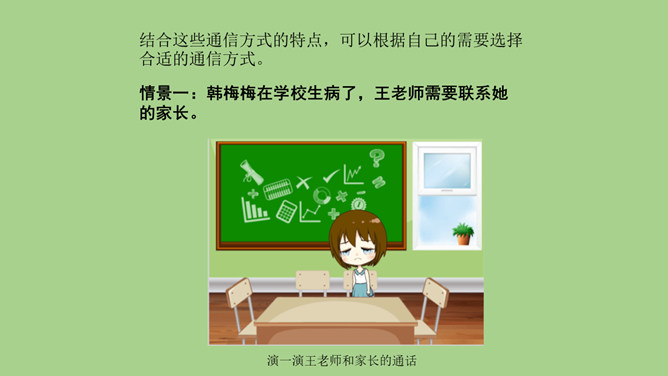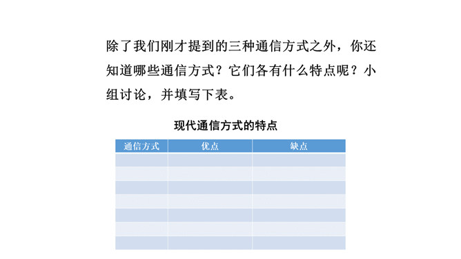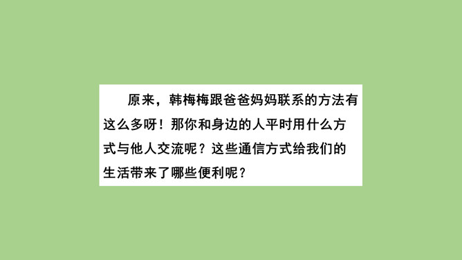 韩梅梅同学自从上次被老师表扬后,就一直勤奋学习。瞧,这次期中考试,她就考了一百分,她多想把这个好消息告诉在外地打工的爸爸妈妈呀!原来,韩梅梅跟爸爸妈妈联系的方法有这么多呀!那你和身边的人平时用什么方式与他人交流呢?这些通信方式给我们的生活带来了哪些便利呢?这些现代通信方式让我们的生活变得真方便,那么它们各有什么特点呢?除了我们刚才提到的三种通信方式之外,你还知道哪些通信方式?它们各有什么特点呢?小组讨论,并填写下表。所属专题:万里一线牵ppt。