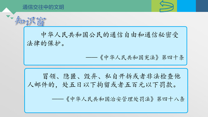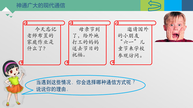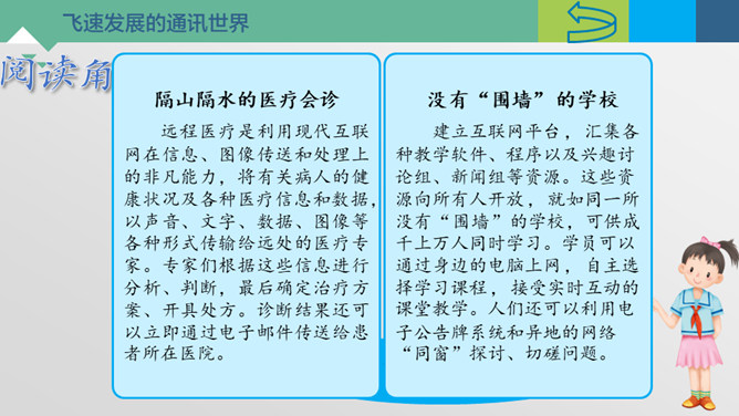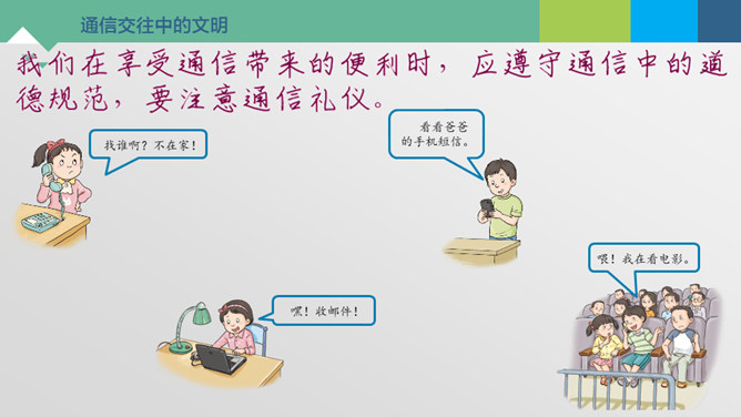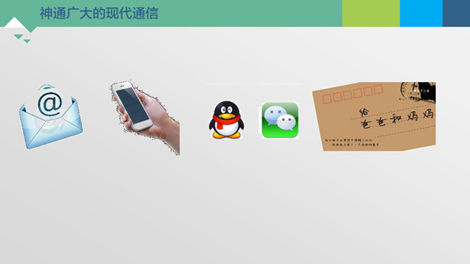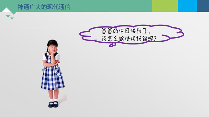 神通广大的现代通信。今天忘记老师布置的家庭作业是什么了?母亲节到了,给外地打工的妈妈送去节日的祝福。邀请国外的小朋友“六一”儿童节来学校参观访问。历史上的通信。飞速发展的通信世界。远程医疗是利用现代互联网在信息、图像传送和处理上的非凡能力,将有关病人的健康状况及各种医疗信息和数据,以声音、文字、数据、图像等各种形式传输给远处的医疗专家。专家们根据这些信息进行分析、判断,最后确定治疗方案、开具处方。诊断结果还可以立即通过电子邮件传送给患者所在医院。通信交往中的文明。所属专题:万里一线牵ppt。