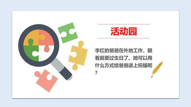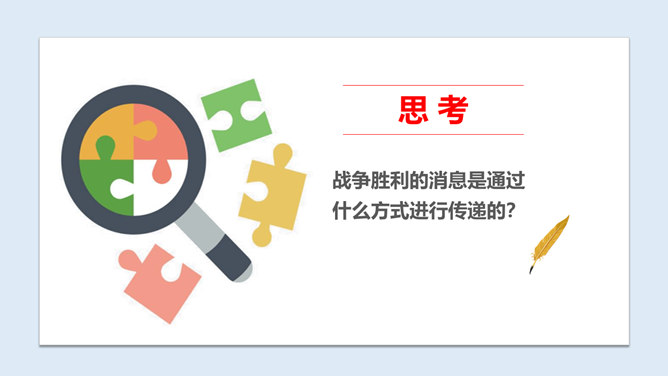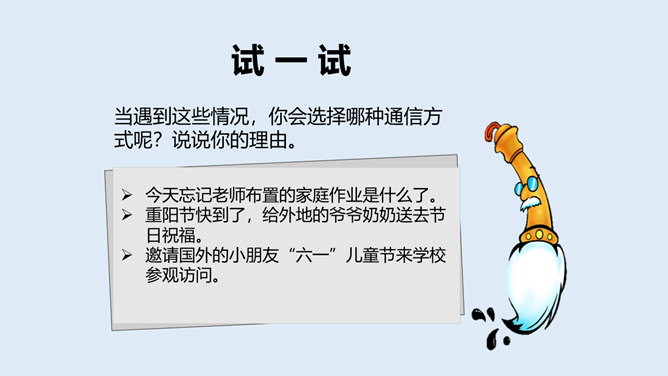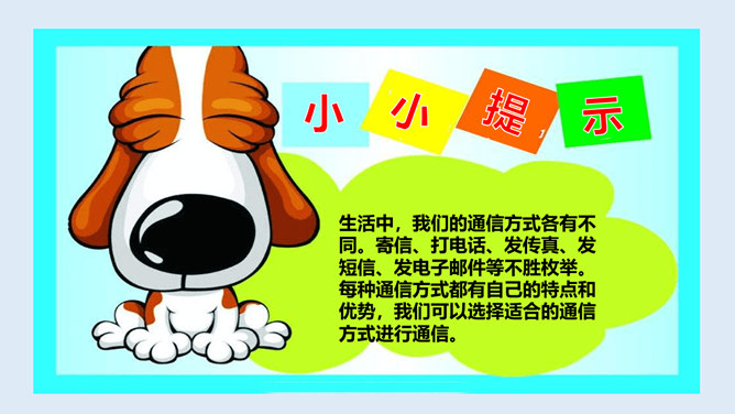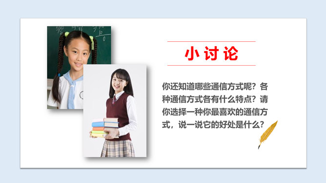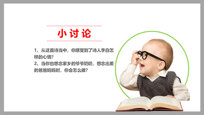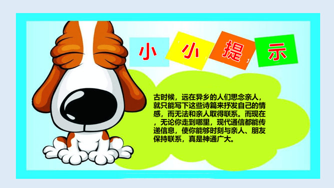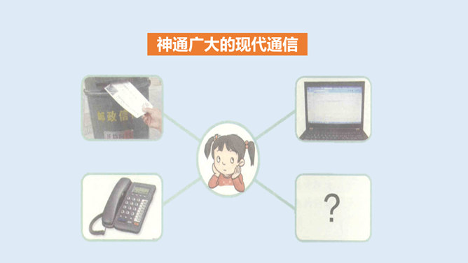 1、从这首诗当中,你感受到了诗人李白怎样的心情?2、当你也想念家乡的爷爷奶奶,想念出差的爸爸妈妈时,你会怎么做?古时候,远在异乡的人们思念亲人,就只能写下这些诗篇来抒发自己的情感,而无法和亲人取得联系。而现在,无论你走到哪里,现代通信都能传递信息,使你能够时刻与亲人、朋友保持联系,真是神通广大。你还知道哪些通信方式呢?各种通信方式各有什么特点?请你选择一种你最喜欢的通信方式,说一说它的好处是什么?你知道古代中国是怎么通信的吗?所属专题:万里一线牵ppt。