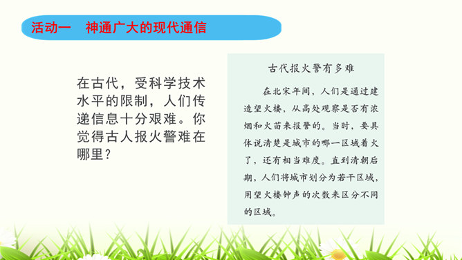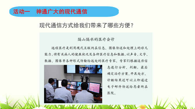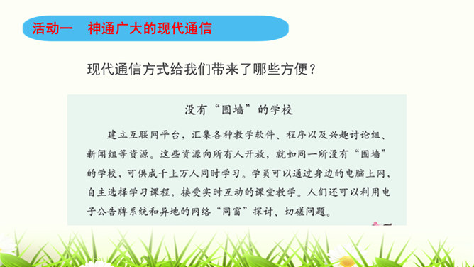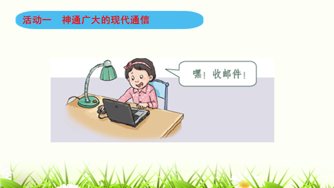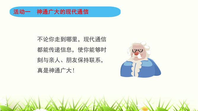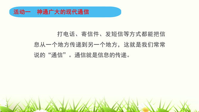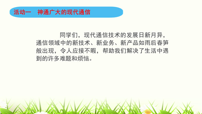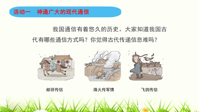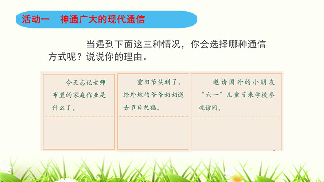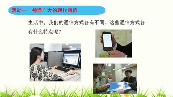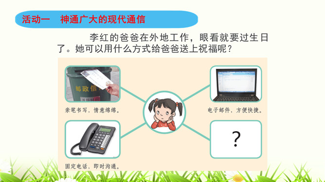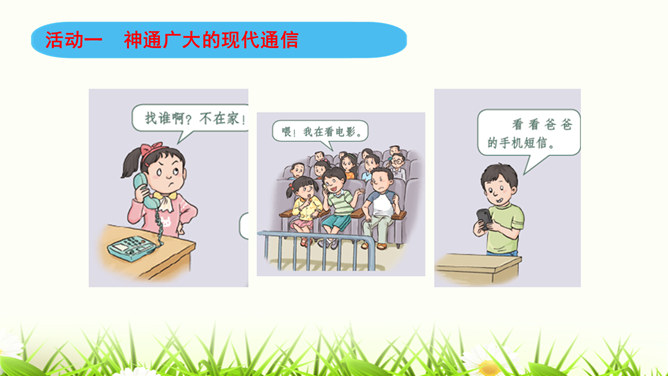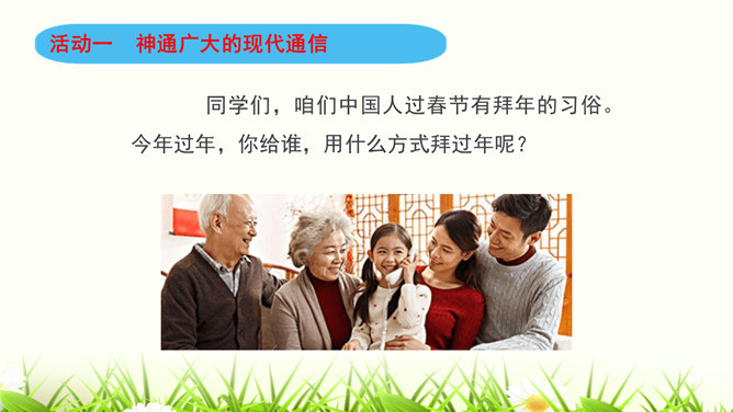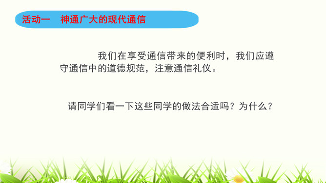 同学们,咱们中国人过春节有拜年的习俗。今年过年,你给谁,用什么方式拜过年呢?打电话、寄信件、发短信等方式都能把信息从一个地方传递到另一个地方,这就是我们常常说的“通信”。通信就是信息的传递。同学们,现代通信技术的发展日新月异,通信领域中的新技术、新业务、新产品如雨后春笋般出现,令人应接不暇,帮助我们解决了生活中遇到的许多难题和烦恼。我们在享受通信带来的便利时,我们应遵守通信中的道德规范,注意通信礼仪。请同学们看一下这些同学的做法合适吗?为什么?所属专题:万里一线牵ppt。