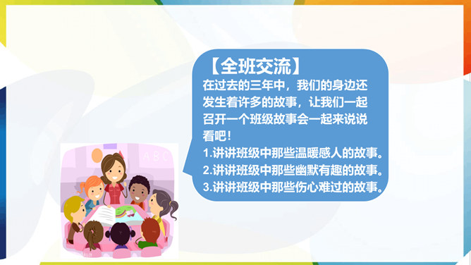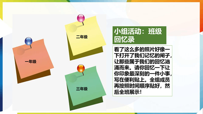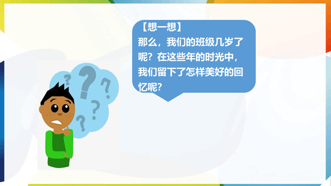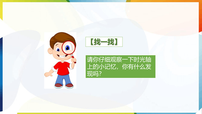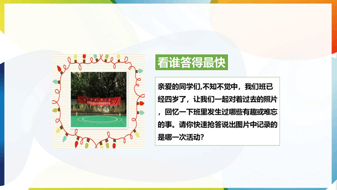 那么,我们的班级几岁了呢?在这些年的时光中,我们留下了怎样美好的回忆呢?亲爱的同学们,不知不觉中,我们班已经四岁了,让我们一起对着过去的照片,回忆一下班里发生过哪些有趣或难忘的事。请你快速抢答说出图片中记录的是哪一次活动?看了这么多的照片好像一下打开了我们记忆的闸子,让那些属于我们的回忆汹涌而来。请你回忆一下让你印象最深刻的一件小事,写在便利贴上。全组成员再按照时间顺序贴好,然后全班展示!请你仔细观察一下时光轴上的小记忆,你有什么发现吗?所属专题:我们班四岁了ppt。