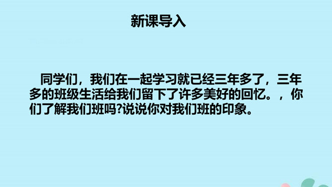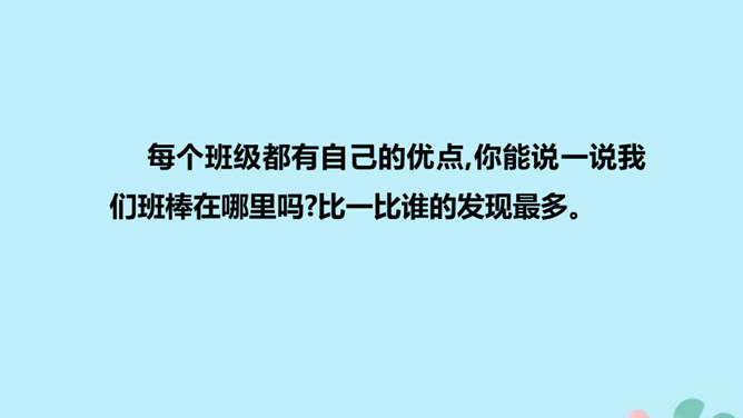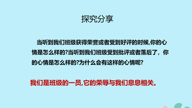 同学们,我们在一起学习就已经三年多了,三年多的班级生活给我们留下了许多美好的回忆。,你们了解我们班吗?说说你对我们班的印象。回忆成长足迹:刚入学时,大家由互不相识到慢慢熟悉。建队日那天,我们一起成为光荣的少先队员。每年大家一起出游。运动会的时候大家齐心协力获得优秀团体奖。三年的时光,一千多个日子,我们朝夕相对,那些给你留下了难忘的印象,和大家分享一下。 当听到我们班级获得荣誉或者受到好评的时候,你的心情是怎么样的?我们是班级的一员,它的荣辱与我们息息相关。所属专题:我们班四岁了ppt。