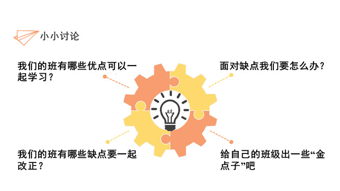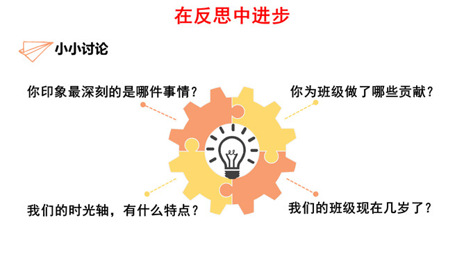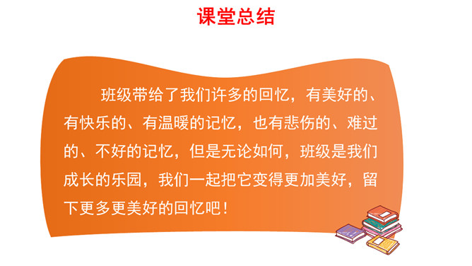 过去的三年,我们在学习、我们在尝试、我们在成长。而我们班级的同学,也从陌生 到熟悉,慢慢地变成了一个团结、快乐的班集体。我们的班有哪些优点可以一起学习?面对缺点我们要怎么办?我们的班有哪些缺点要一起改正?给自己的班级出一些“金点子”吧。班级带给了我们许多的回忆,有美好的、有快乐的、有温暖的记忆,也有悲伤的、难过的、不好的记忆,但是无论如何,班级是我们成长的乐园,我们一起把它变得更加美好,留下更多更美好的回忆吧!所属专题:我们班四岁了ppt。