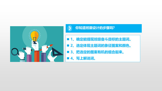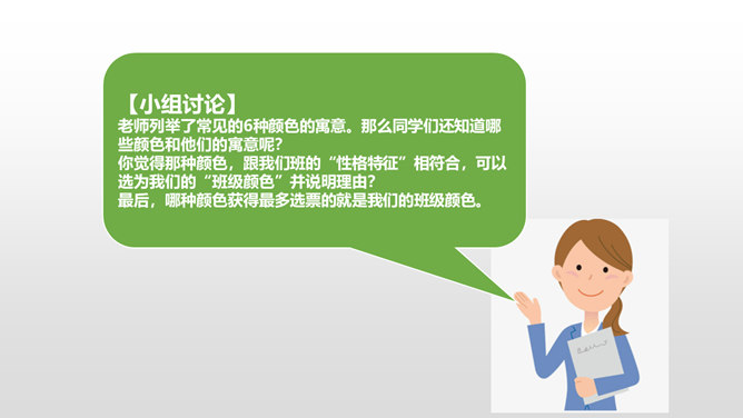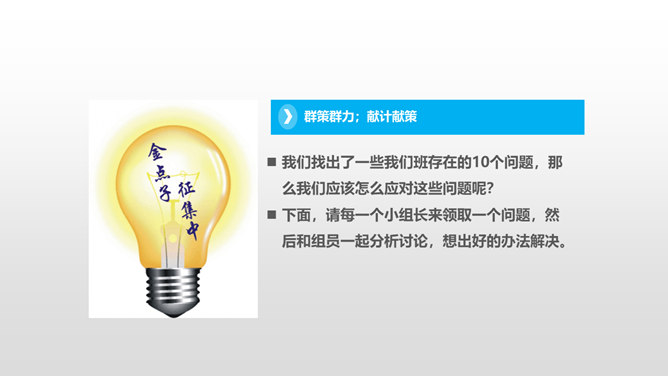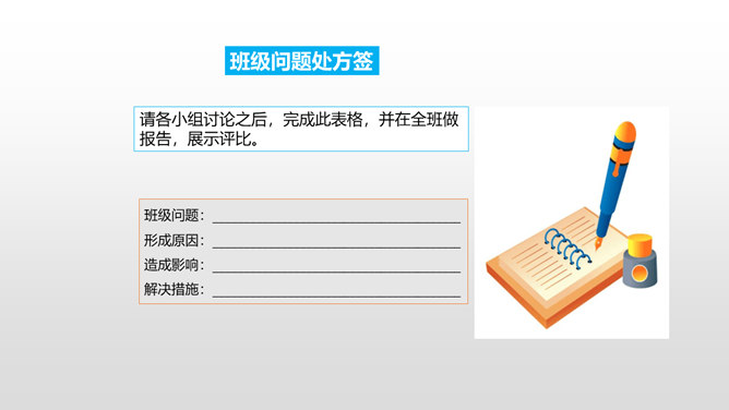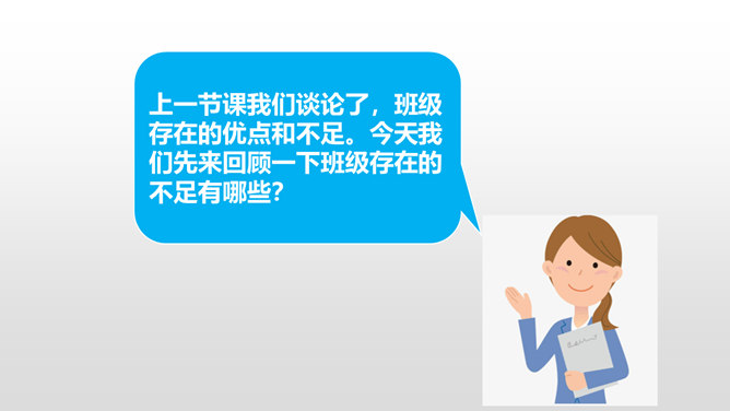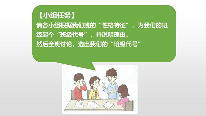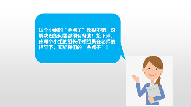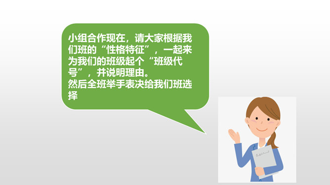 上一节课我们谈论了,班级存在的优点和不足。今天我们先来回顾一下班级存在的不足有哪些?我们找出了一些我们班存在的10个问题,那么我们应该怎么应对这些问题呢?下面,请每一个小组长来领取一个问题,然后和组员一起分析讨论,想出好的办法解决。每个小组的“金点子”都很不错,对解决班级问题都很有帮助!接下来,由每个小组的组长带领组员在老师的指导下,实施你们的“金点子”!小组合作现在,请大家根据我们班的“性格特征”,一起来为我们的班级起个“班级代号”,并说明理由。所属专题:我们班四岁了ppt。
