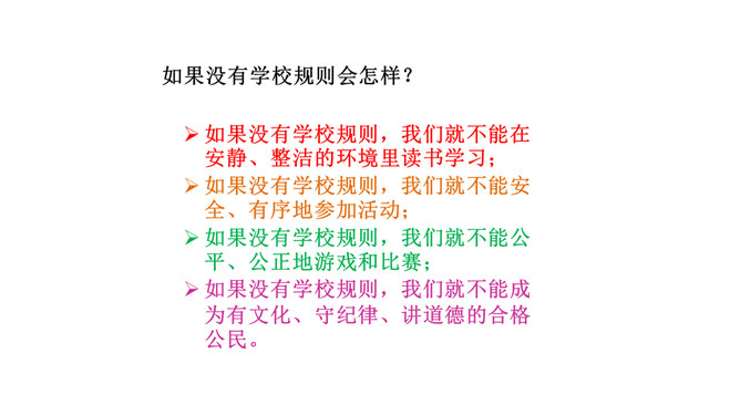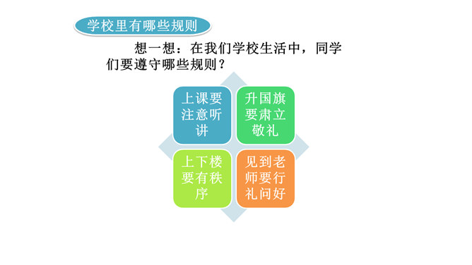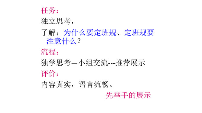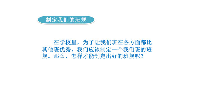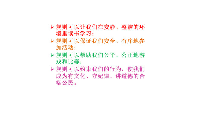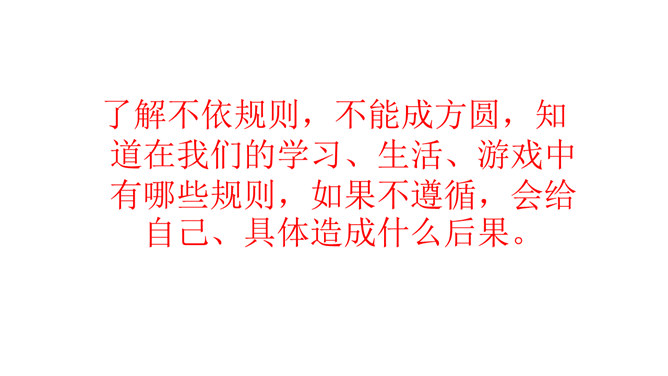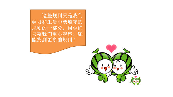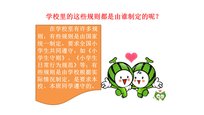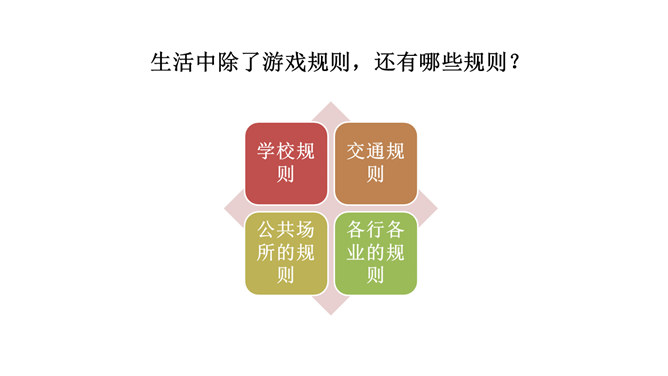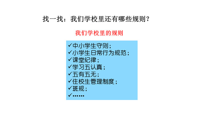 了解不依规则,不能成方圆,知道在我们的学习、生活、游戏中有哪些规则,如果不遵循,会给自己、具体造成什么后果。风筝与线的关系?若不是线的制约,哪有风筝的高翔?校园不文明现象有哪些?我们应该如何做?生活中除了游戏规则,还有哪些规则?想一想:在我们学校生活中,同学们要遵守哪些规则?这些规则只是我们学习和生活中要遵守的规则的一部分。同学们只要我们用心观察,还能找到更多的规则!学校里的这些规则都是由谁制定的呢?有些规则是由国家统一制定,有些规则是由学校根据实际情况制定。所属专题:我们的班规我们订ppt。