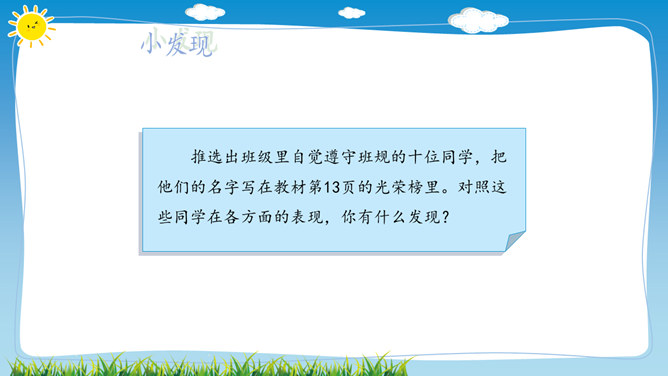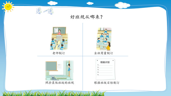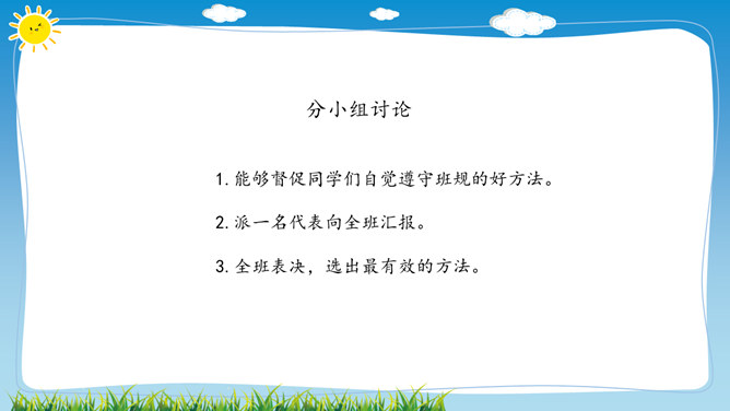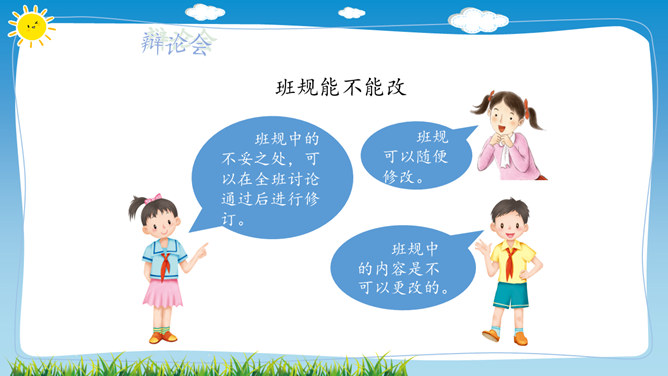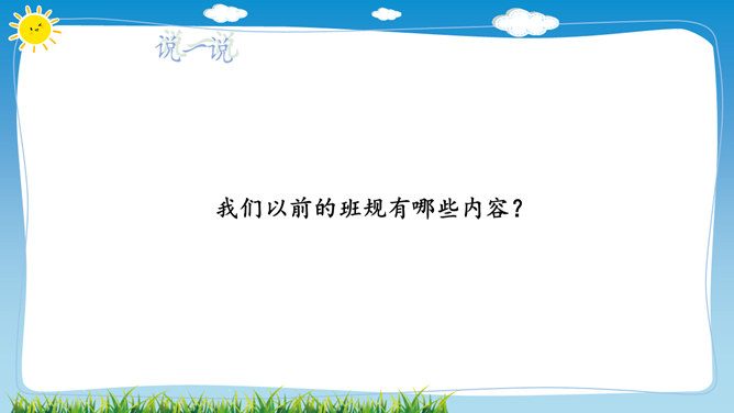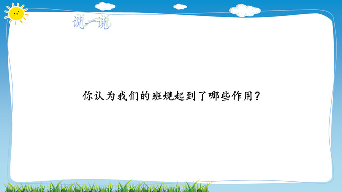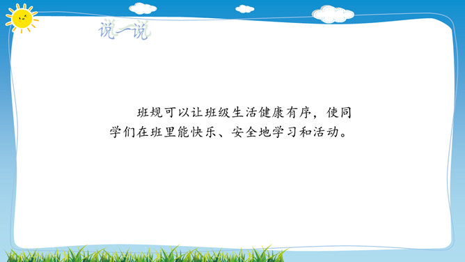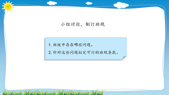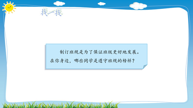 活动一:感谢旧班规。我们以前的班规有哪些内容?你认为我们的班规起到了哪些作用?班规可以让班级生活健康有序,使同学们在班里能快乐、安全地学习和活动。活动二:制订新班规。小组讨论,制订班规:1.班级中存在哪些问题。2.针对这些问题拟定可行的班规条款。活动三:班规重执行。假如他们不遵守规则会怎样?分小组讨论:1.能够督促同学们自觉遵守班规的好方法。2.派一名代表向全班汇报。3.全班表决,选出最有效的方法。制订班规是为了保证班级更好地发展。在你身边,哪些同学是遵守班规的榜样?所属专题:我们的班规我们订ppt。