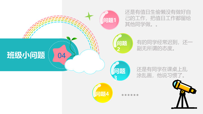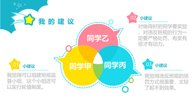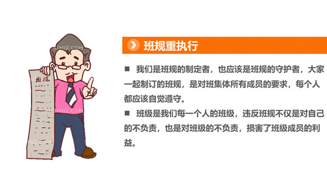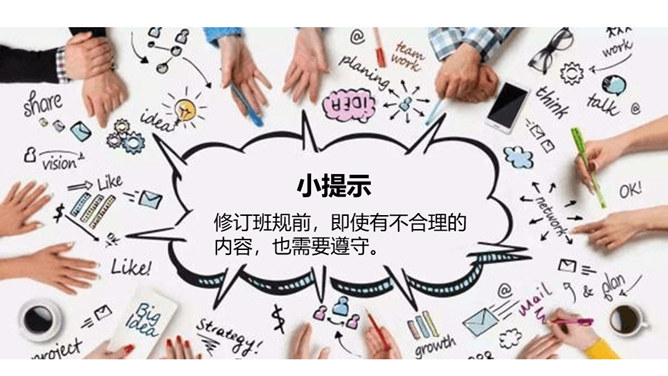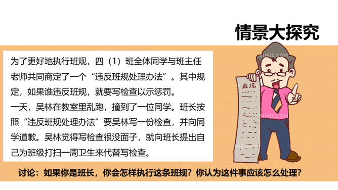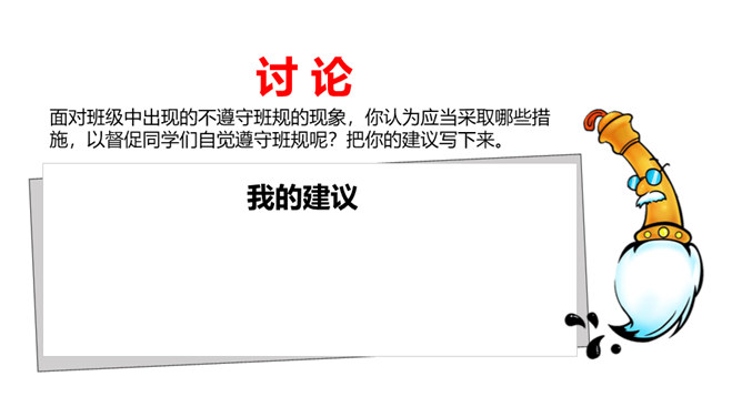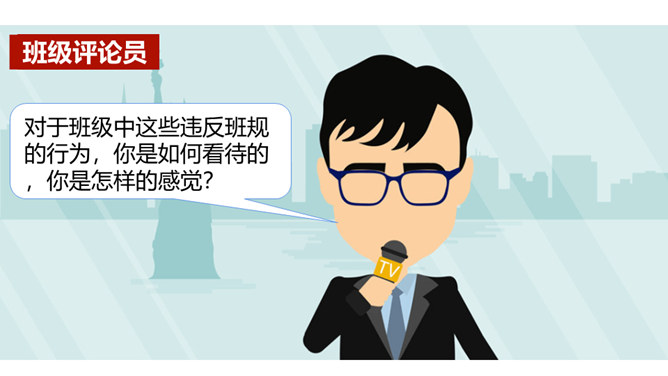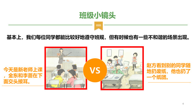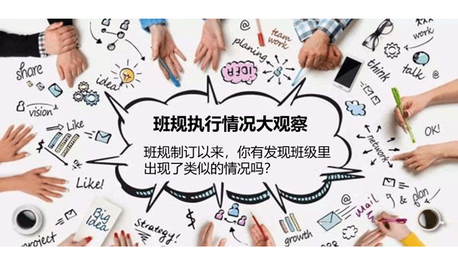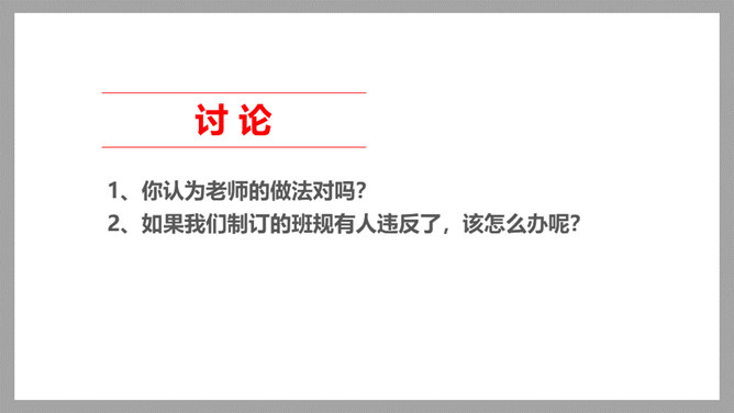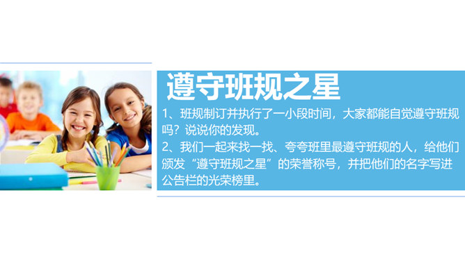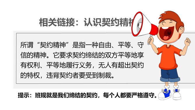 讨论:1、你认为老师的做法对吗?2、如果我们制订的班规有人违反了,该怎么办呢?遵守班规之星:1、班规制订并执行了一小段时间,大家都能自觉遵守班规吗?说说你的发现。2、我们一起来找一找、夸夸班里最遵守班规的人,给他们颁发“遵守班规之星”的荣誉称号,并把他们的名字写进公告栏的光荣榜里。基本上,我们每位同学都能比较好地遵守班规,但有时候也有一些不和谐的场景出现。今天是新老师上课,金东和李蔷在下面交头接耳。赵方看到别的同学随地扔废纸,他也扔了一个纸团。所属专题:我们的班规我们订ppt。
