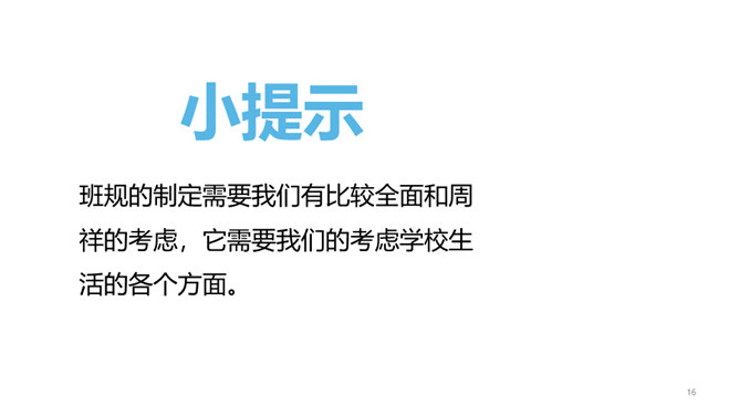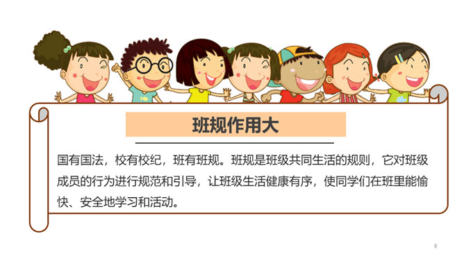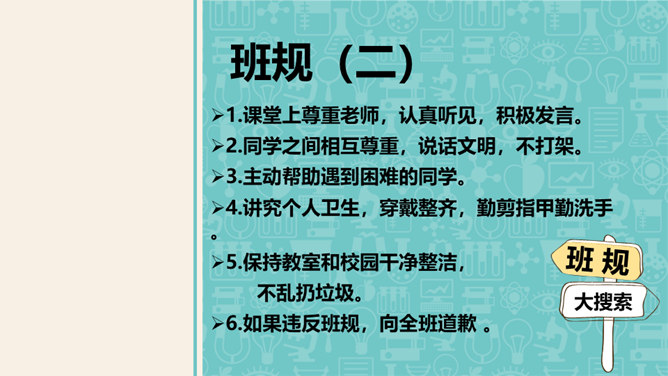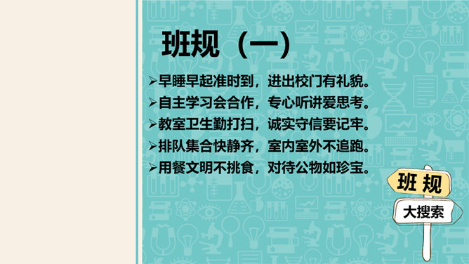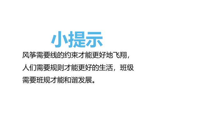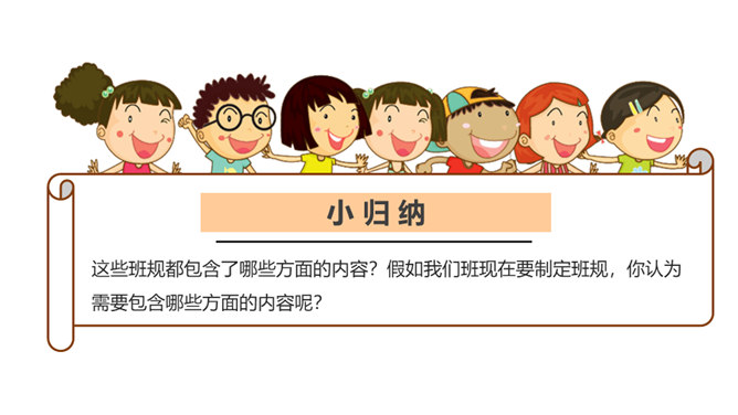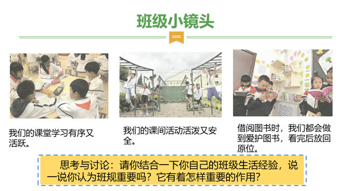 如果在班级里做什么都不会受到惩罚,都不会被批评责怪,你觉得你自己可能会产生哪些不好的行为?班级里可能会出现些什么情况?思考与讨论:请你结合一下你自己的班级生活经验,说一说你认为班规重要吗?它有着怎样重要的作用?请你把课后搜索到的班规和小组的同学进行讨论,看看班规的内容都有哪些。个班级的事情,也是所有班级成员的事情。只有我们每个人都参与其中,民主决定班规,才能更好地保证班规的科学性、合理性,也更能让班级成员认可和执行,从而促进班级的健康发展!所属专题:我们的班规我们订ppt。