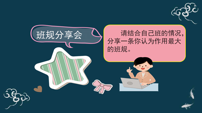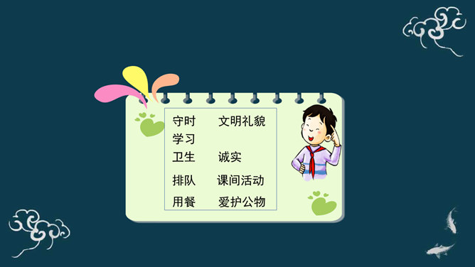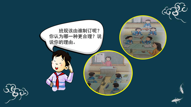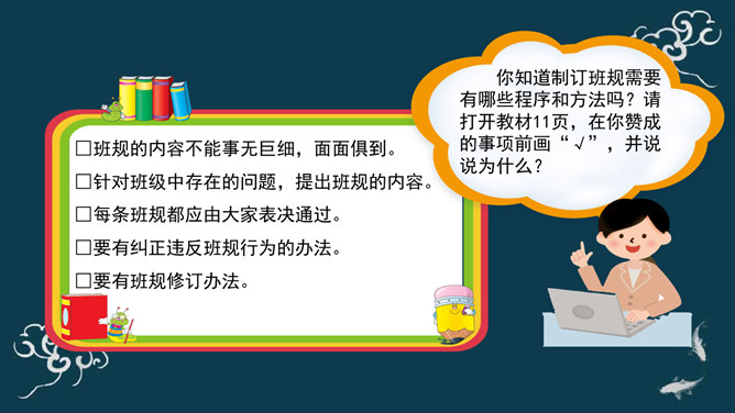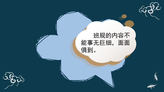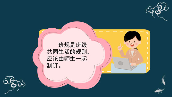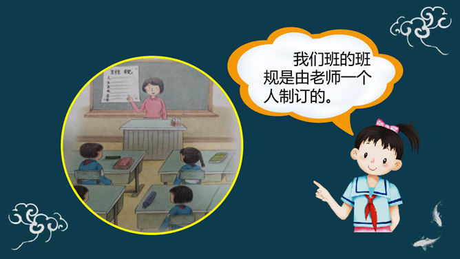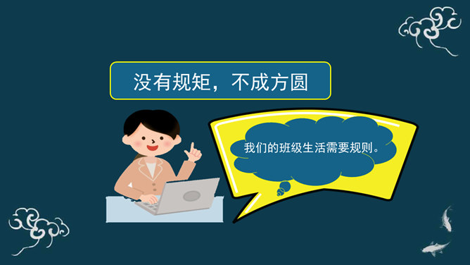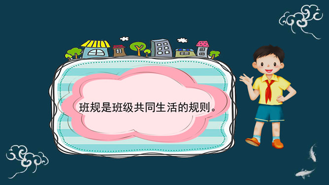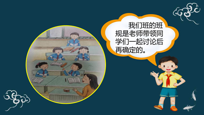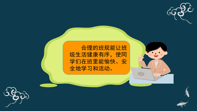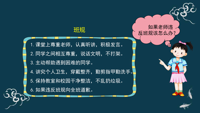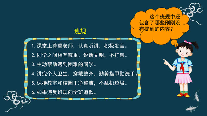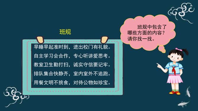 早睡早起准时到,进出校门有礼貌。自主学习会合作,专心听讲爱思考。教室卫生勤打扫,诚实守信要记牢。排队集合快静齐,室内室外不追跑。用餐文明不挑食,对待公物如珍宝。班规中包含了哪些方面的内容?请你找一找。1.课堂上尊重老师,认真听讲,积极发言。2.同学之间相互尊重,说话文明,不打架。3.主动帮助遇到困难的同学。4.讲究个人卫生,穿戴整齐,勤剪指甲勤洗手。5.保持教室和校园干净整洁,不乱扔垃圾。6.如果违反班规向全班道歉。这个班规中还包含了哪些刚刚没有提到的内容?所属专题:我们的班规我们订ppt。