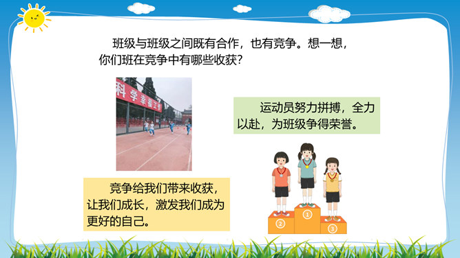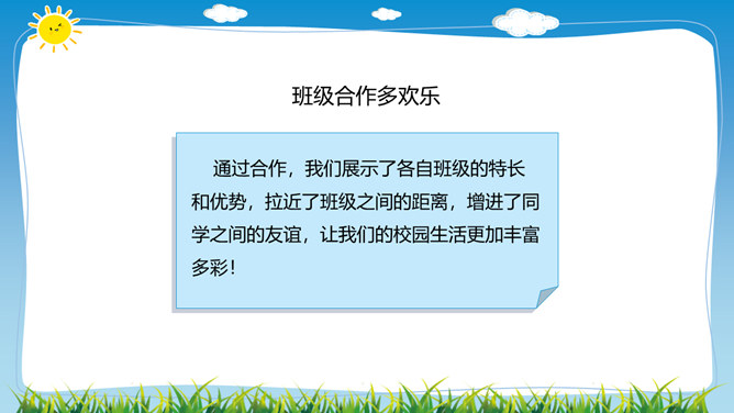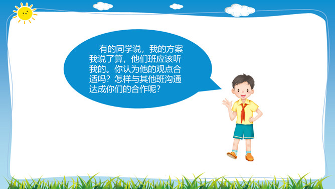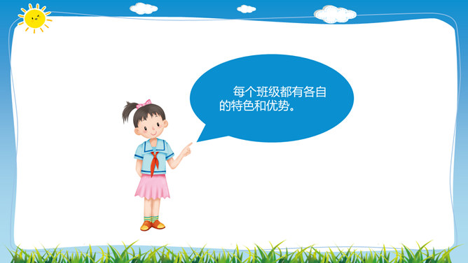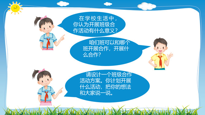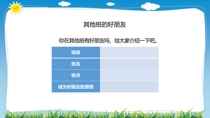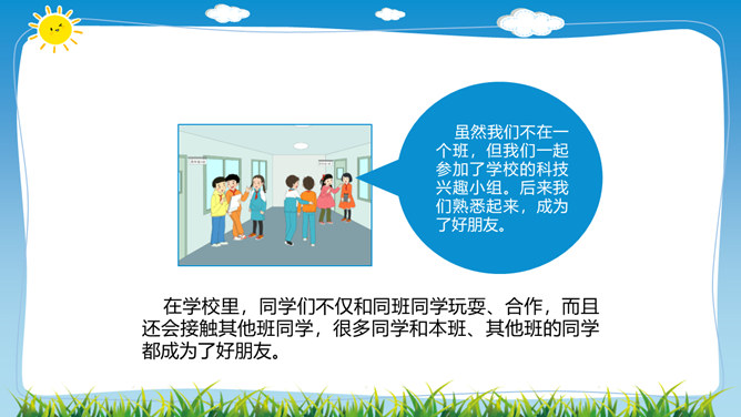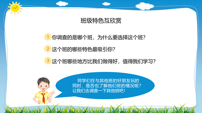 在学校里,同学们不仅和同班同学玩耍、合作,而且还会接触其他班同学,很多同学和本班、其他班的同学都成为了好朋友。虽然我们不在一个班,但我们一起参加了学校的科技兴趣小组。后来我们熟悉起来,成为了好朋友。你在其他班有好朋友吗,给大家介绍一下吧。班级特色互欣赏:你调查的是哪个班,为什么要选择这个班?这个班的哪些特色最吸引你?这个班哪些地方比我们做得好,值得我们学习?同学们在与其他班的好朋友玩的同时,是否也了解他们班的情况呢?让我们去调查一下其他班吧!所属专题:我们班他们班ppt。
