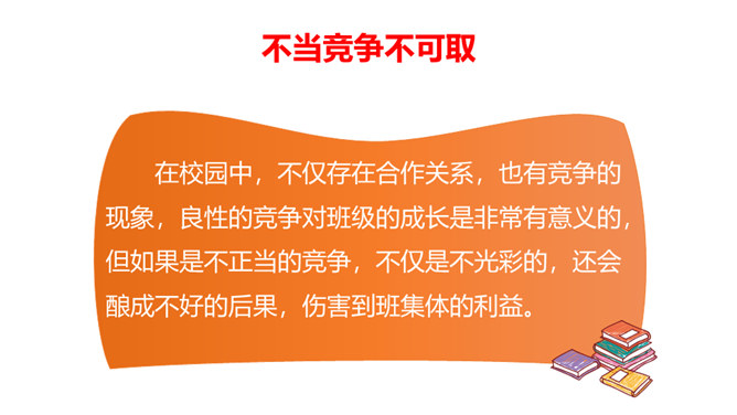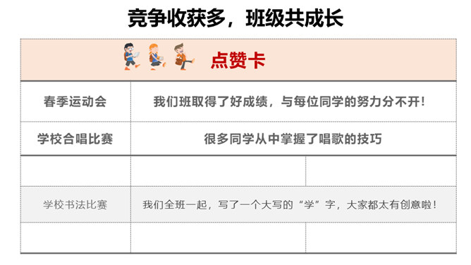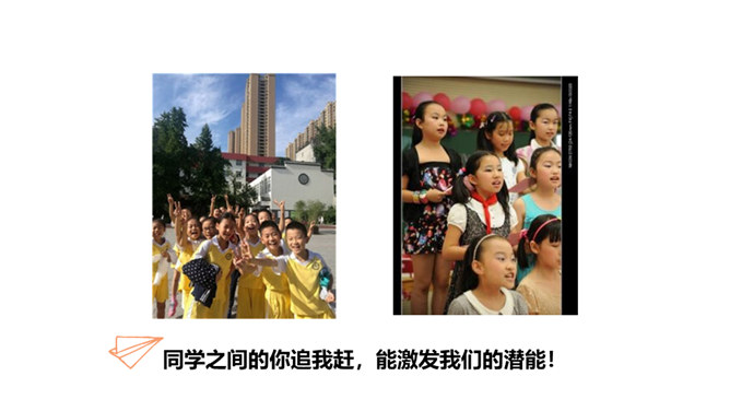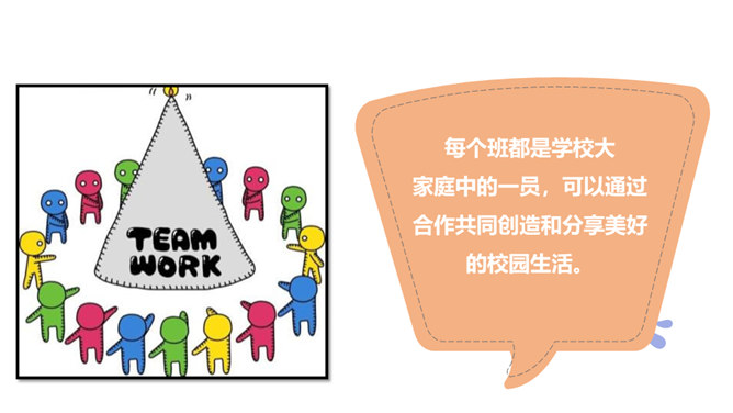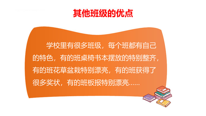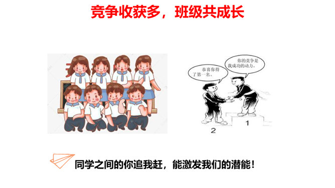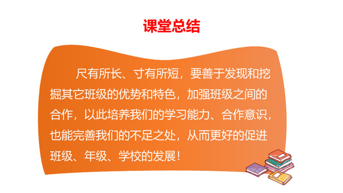 学校里有很多班级,每个班都有自己的特色,有的班桌椅书本摆放的特别整齐,有的班花草盆栽特别漂亮,有的班获得了很多奖状,有的班板报特别漂亮……要善于发现其他班级其他同学的闪光点,通过向他们学习,取长补短,提高自己。每个班都是学校大家庭中的一员,可以通过合作共同创造和分享美好的校园生活。尺有所长、寸有所短,要善于发现和挖掘其它班级的优势和特色,加强班级之间的合作,以此培养我们的学习能力、合作意识,也能完善我们的不足之处,从而更好的促进班级、年级、学校的发展!所属专题:我们班他们班ppt。