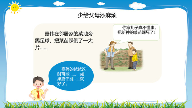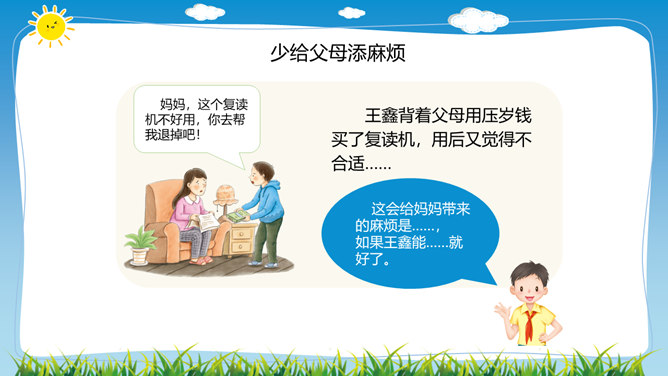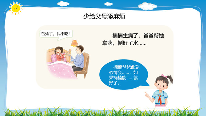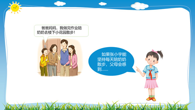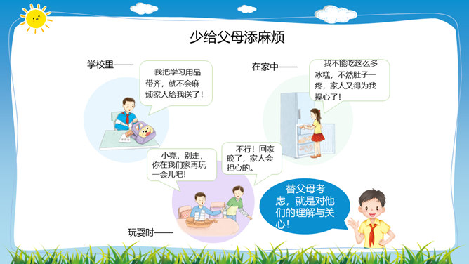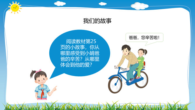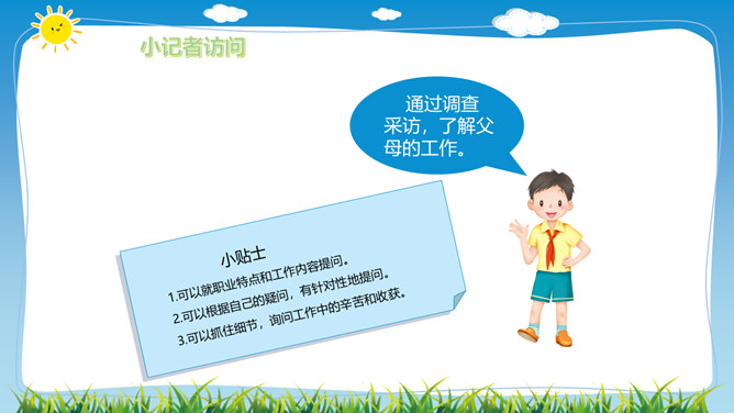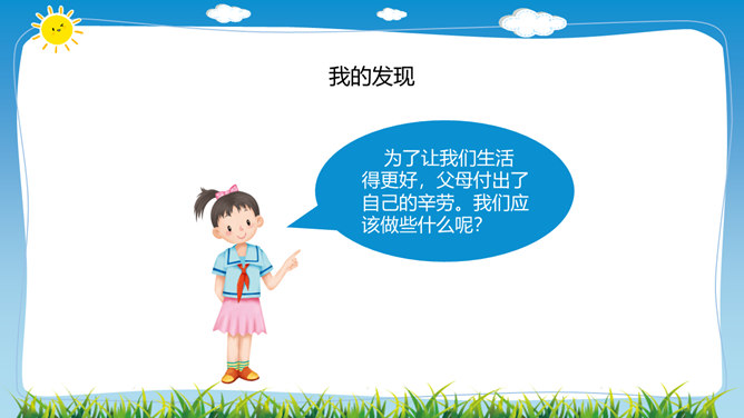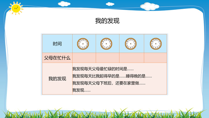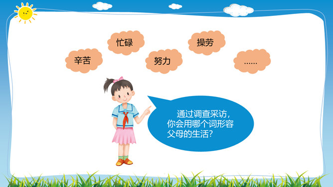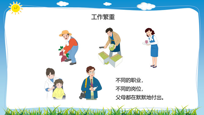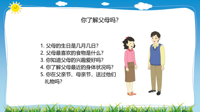 你了解父母吗?1. 父母的生日是几月几日?2. 父母最喜欢的食物是什么?3. 你知道父母的兴趣爱好吗?4. 你了解父母最近的身体状况吗?5. 你在父亲节、母亲节,送过他们礼物吗?活动一:爸爸妈妈多辛苦。不同的职业,不同的岗位,父母都在默默地付出。通过调查采访,了解父母的工作。1.可以就职业特点和工作内容提问。2.可以根据自己的疑问,有针对性地提问。3.可以抓住细节,询问工作中的辛苦和收获。除了这些,父母还要为家中做什么呢?我发现每天父母最忙碌的时间是…… 我发现每天比我起得早的是……睡得晚的是……所属专题:少让父母为我操心ppt。